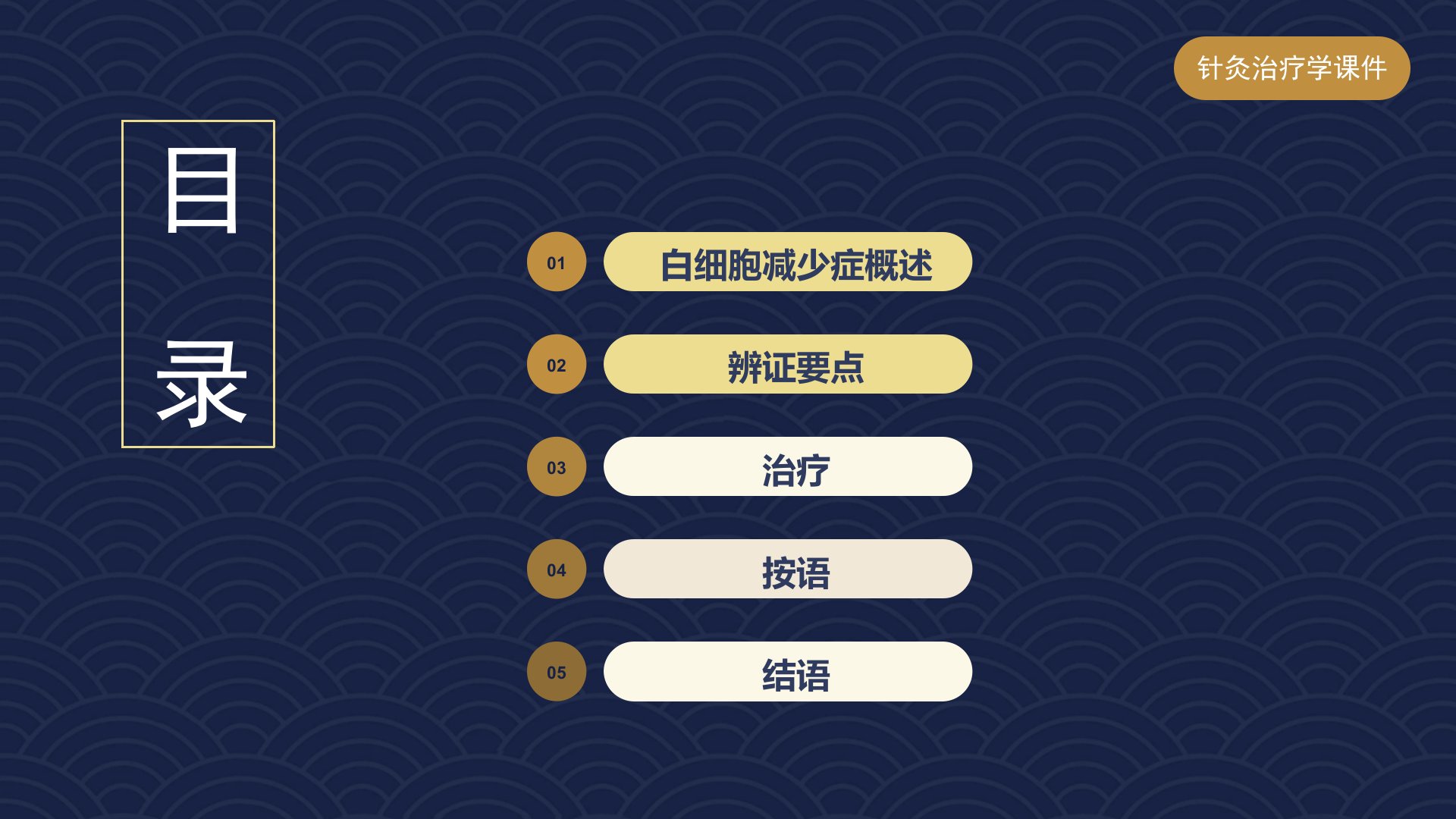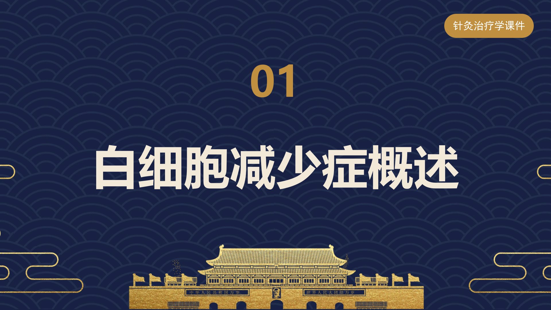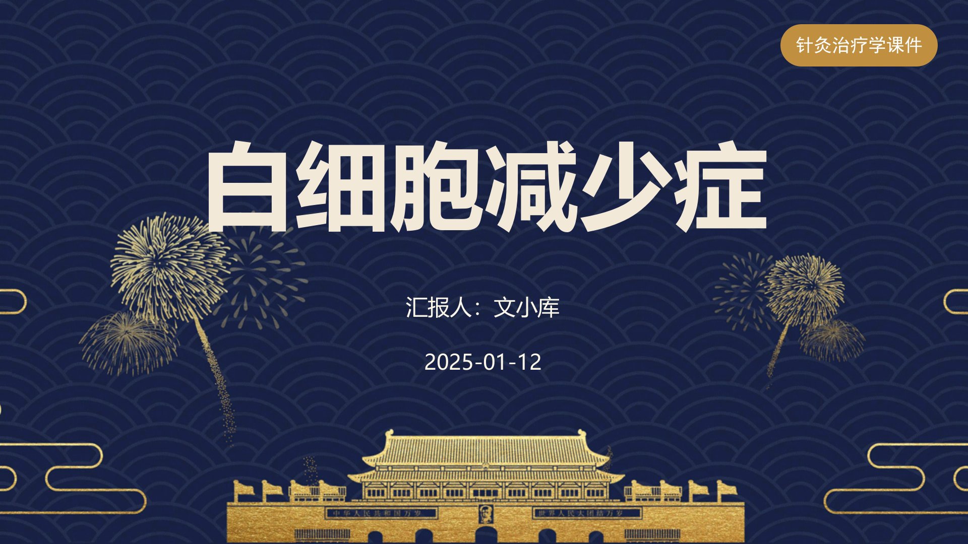白细胞减少症针灸治疗学课件摘要汇报人:文小库日期:20250112。本课件聚焦白细胞减少症针灸治疗内容涵盖多方面。白细胞减少症指外周血液中白细胞数持续低于410L轻度减少多无特殊症状中度和重度减少者易感染伴疲乏无力等非特异症状。病因分原发性和继发性中医属“虚劳”“虚损”范畴病位在脾肾基本病机是脾肾亏虚、精血不足。辨证要点上主症为白细胞数低伴头晕乏力脾胃虚弱者面色萎黄、神疲气短等脾肾阳虚者畏寒肢冷、腰膝酸软等。治疗以健脾益气温肾固本为法取任脉、督脉穴和脾、肾背俞穴为主如气海、大椎等配穴依证型而定毫针常规刺加灸还有灸法、耳针、穴位注射等疗法。研究表明针灸对原发性白细胞减少症疗效优于继发性艾灸升白细胞作用强于针刺。治疗需综合考量生活中应避免劳累熬夜保持心情愉悦。