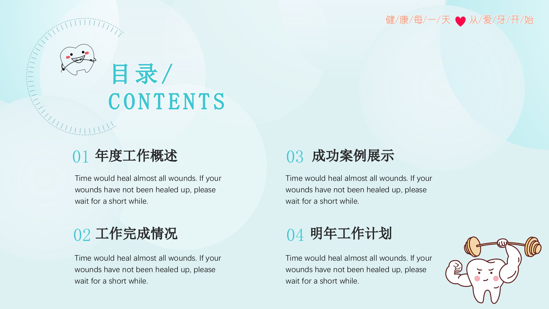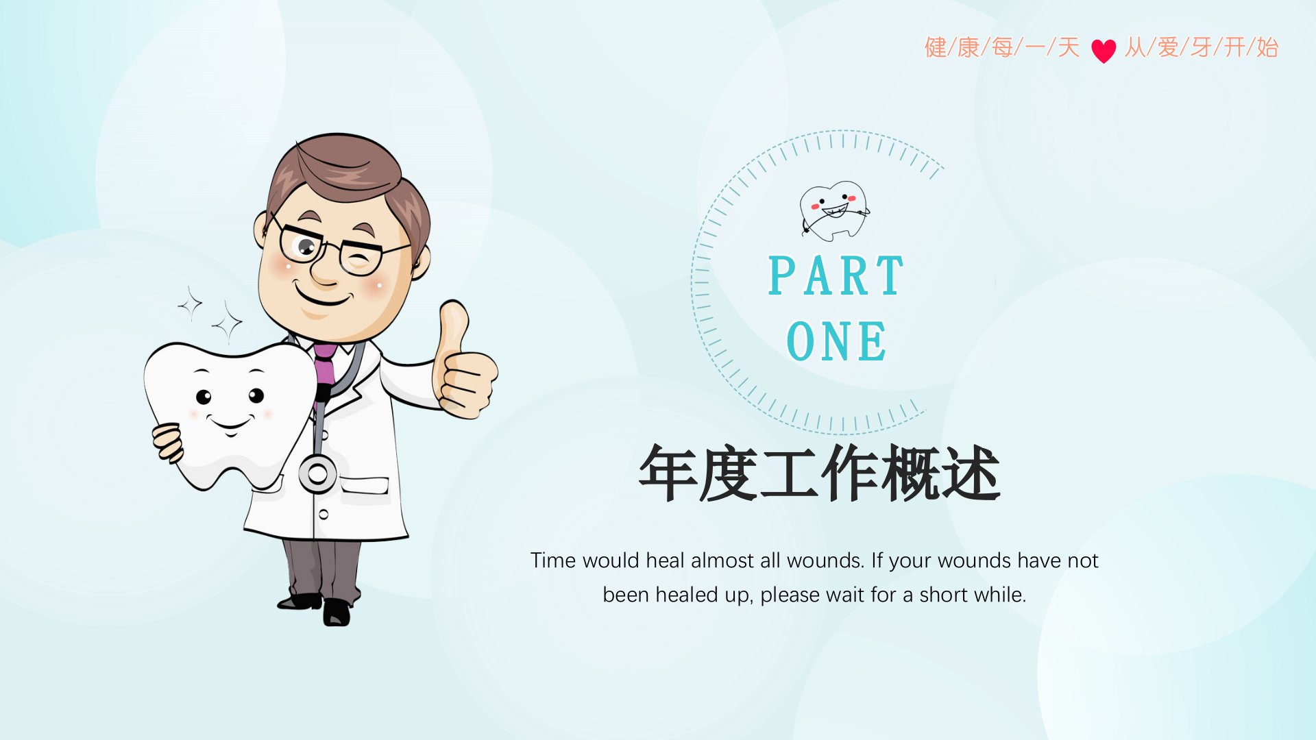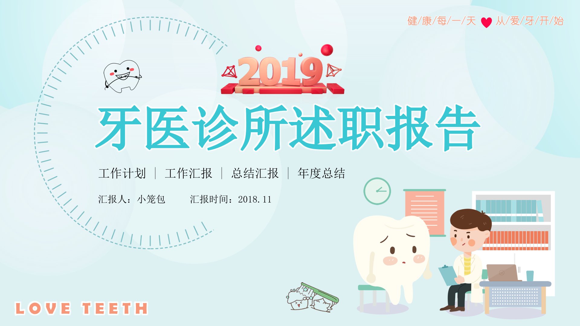 牙医诊所述职报告与年度总结摘要本报告由牙医小笼包于2018年11月撰写主题为“健康每一天从爱牙开始”。报告分为四个主要部分:1年度工作概述:简要回顾了过去一年牙科诊所的整体运营情况强调了爱牙护牙的重要性。2工作完成情况:概述了诊所在治疗患者数量、手术成功率、患者满意度提升及新技术引进等方面的成绩具体内容未详尽阐述但体现了工作的高效与专业。3成功案例展示:列举了几个典型治疗案例展示了诊所在处理复杂牙科问题上的能力具体案例内容未详细说明。4明年工作计划:提出了诊所未来的发展方向包括提升服务质量、引进先进设备、加强医护人员培训等旨在进一步提高诊所的整体水平。报告整体简洁明了注重版面美观传达了诊所对牙科健康的重视及对未来发展的积极规划。