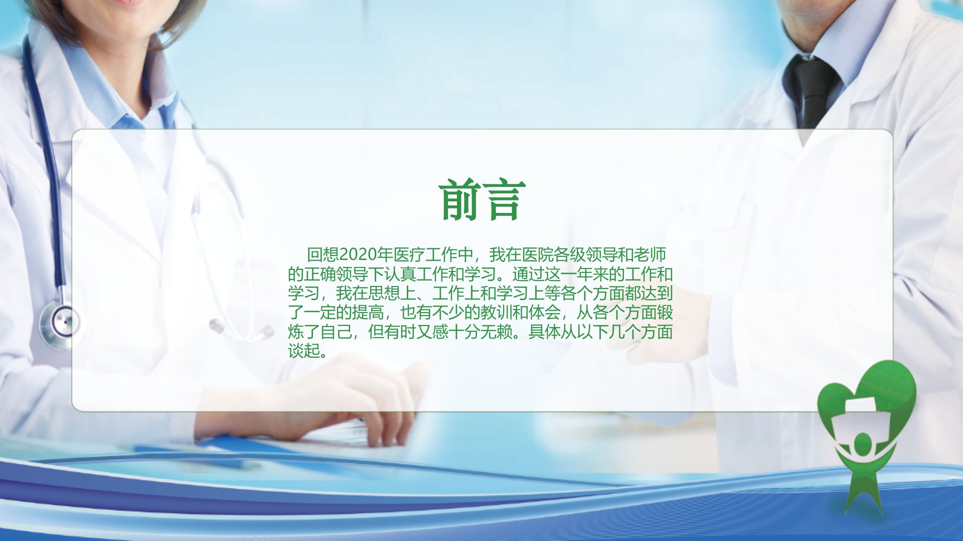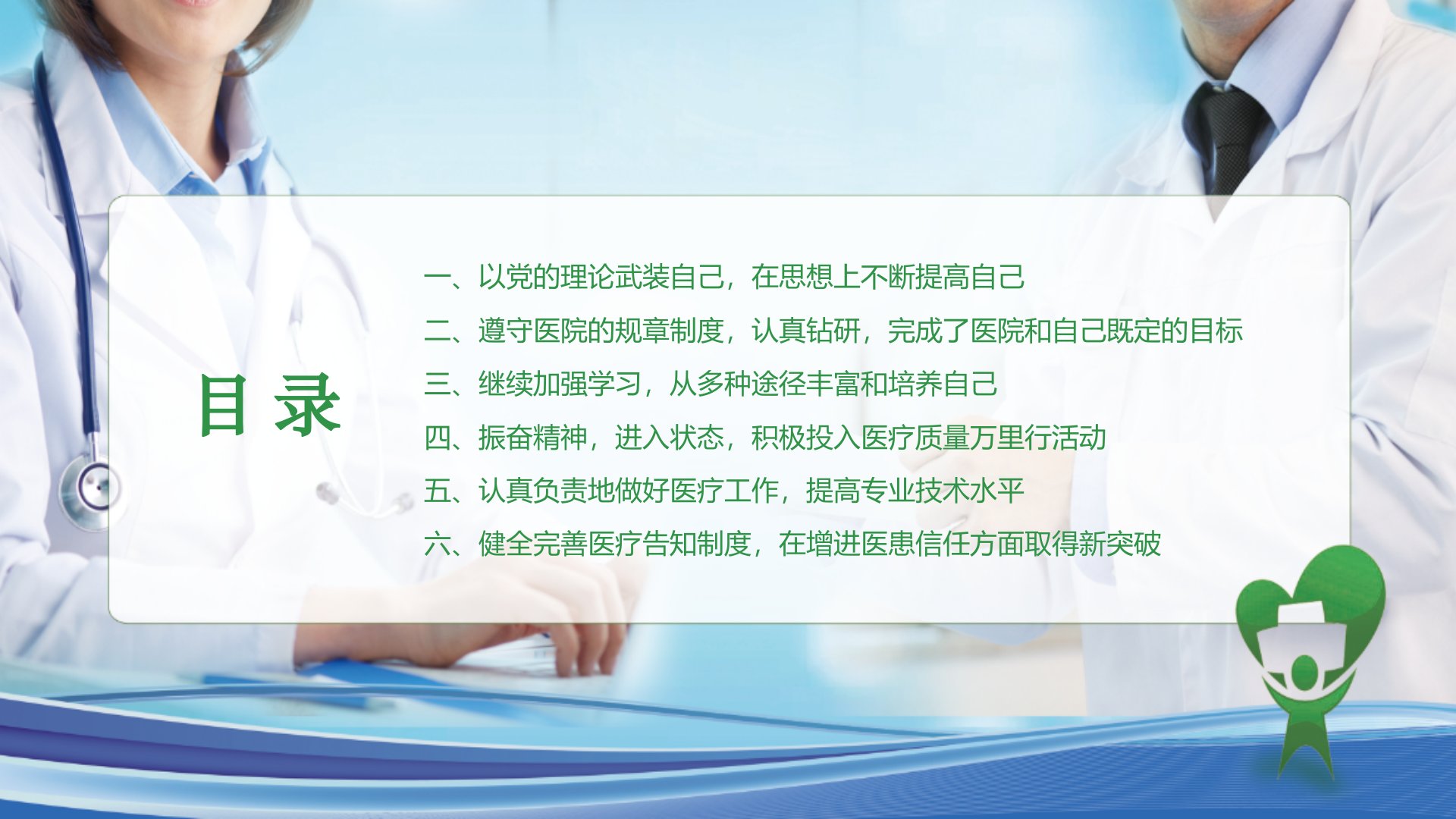 医生年终述职报告摘要汇报人XXX回顾202X年医疗工作在各级领导和老师的指导下我在思想、工作和学习上均有所提升也积累了经验教训。思想方面深入学习党的基本理论、方针和政策认真学习了党的十九大的系列理论进一步端正服务理念增强服务意识坚持“以病人为中心”立足本职踏实服务。工作上我遵守医院规章制度钻研业务完成既定目标。坚持业务学习不放松每天掌握一种疾病汲取新营养;坚持“精益求精”严格遵循医疗常规避免事故差错;丰富临床经验向上级医师请教提高解决问题能力;严密观察病情及时准确记录。学习方面我温习大学知识从多种途径丰富医学知识。同时健全完善医疗告知制度增强大局意识构建和谐医患关系为病人营造温馨就医环境以精湛技术和服务让病人放心不断提升医疗服务水平。