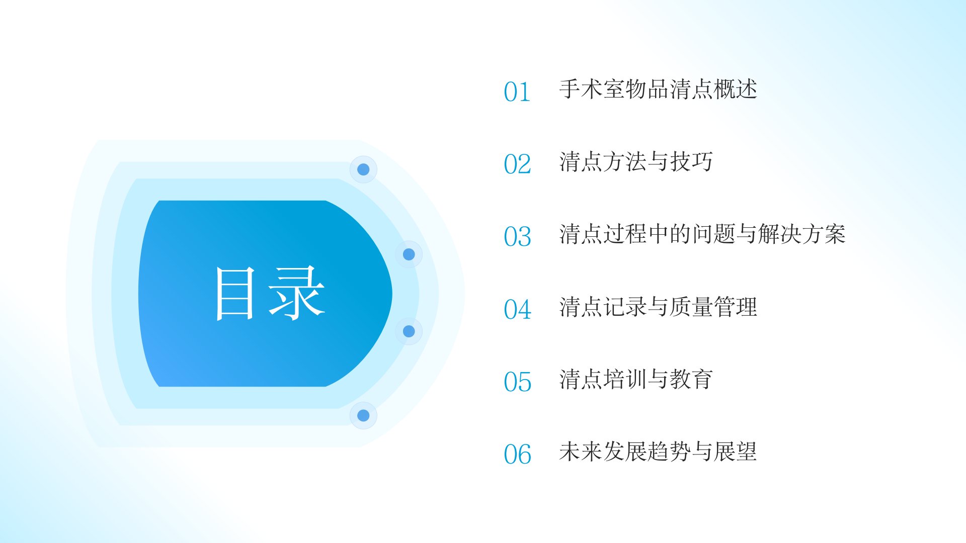 《手术室物品清点》PPT摘要汇报人xxx从六方面介绍手术室物品清点工作。1手术室物品清点概述:清点可避免医疗错误确保手术安全提高准确性增强信任感符合医疗规范。清点流程包括清点前准备、清点中操作及清点后整理。清点团队包括手术室护士、医生与助手及其他团队成员。2清点方法与技巧:人工清点操作简单但效率低、易出错可通过增强责任心、优化流程和引入辅助工具改进;电子清点系统可提高效率、减少错误但设备成本高。建议人工与电子系统结合并通过流程优化、员工培训和技术升级提升效率。3清点问题与解决方案:清点失误或因人员疲劳、方法不统一、环境干扰等导致会造成延误手术、增加风险等后果。可通过完善制度、加强团队协作等预防利用技术手段辅助清点。4清点记录与质量管理:清点记录可作为法律证据支持管理决策。记录需准确完整并定期检查审核。同时要制定质量改进计划定期评估建立健全质量管理体系。5清点培训与教育:培训包括理论与技能培训、案例分析与实操练习需设定评估标准收集反馈以改进。同时要整合教育资源建立共享平台。6未来发展趋势:未来清点工作将应用新型技术、融合互联网医疗同时创新管理模式、加强国际合作。