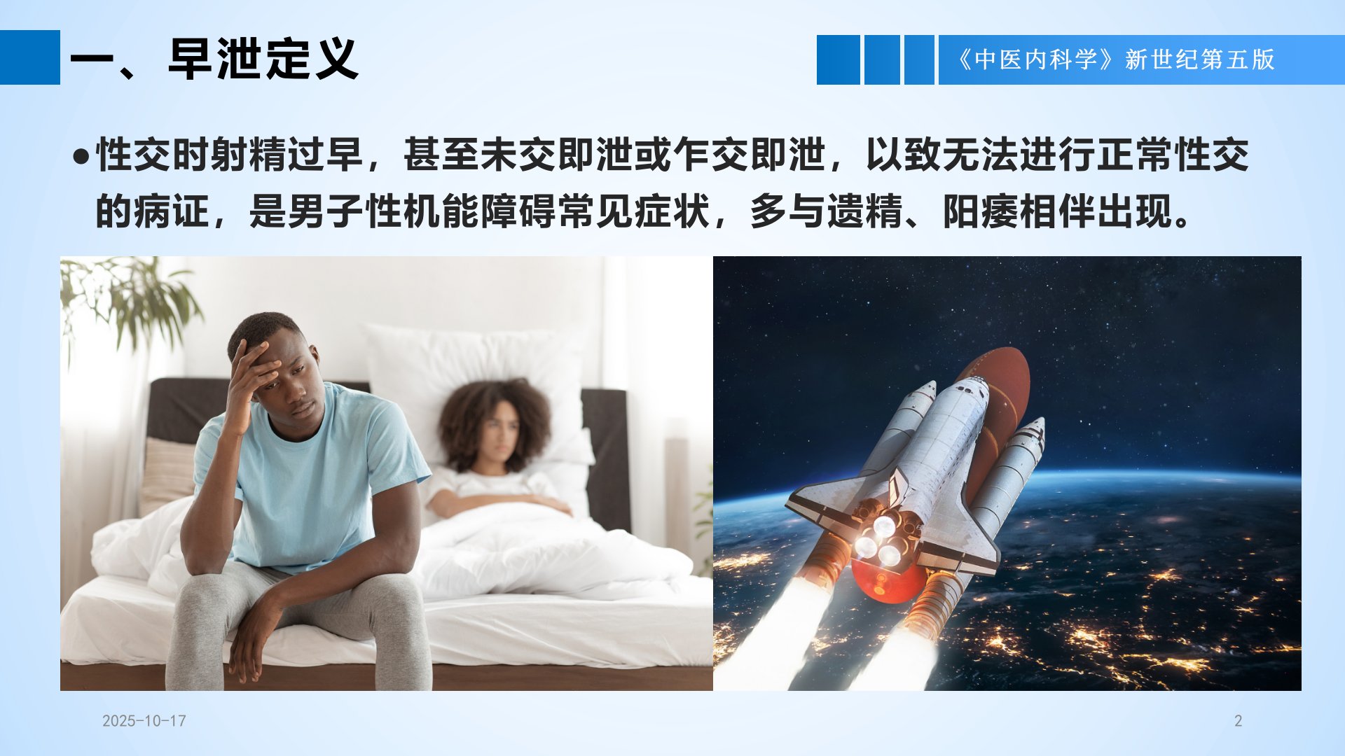 早泄是男子性机能障碍常见症状多与遗精、阳痿相伴。其病因包括情志内伤、湿热侵袭、纵欲过度、久病体虚基本病机为精关封藏失职与心、肝、肾相关证型特点多为虚多实少或本虚标实。治疗原则方面虚证以补脾肾为主佐以固涩;实证以清热利湿为主慎用补涩;阴阳两虚则阴阳双补。分证论治中肝经湿热证表现为早泄、口苦咽干等治以清泻肝经湿热用龙胆泻肝汤加减;心脾两虚证表现为早泄、心悸怔忡等治以补益心脾用归脾汤加减可加补肾固涩药;肾气不固证表现为早泄遗精、腰膝酸软等治以益肾固精用金匮肾气丸加减可加龙骨、牡蛎等固精药夜尿频多则加益智仁、乌药温肾缩尿。预后与调护方面需遵医嘱用药注意饮食、情志、作息等适当锻炼增强体质。