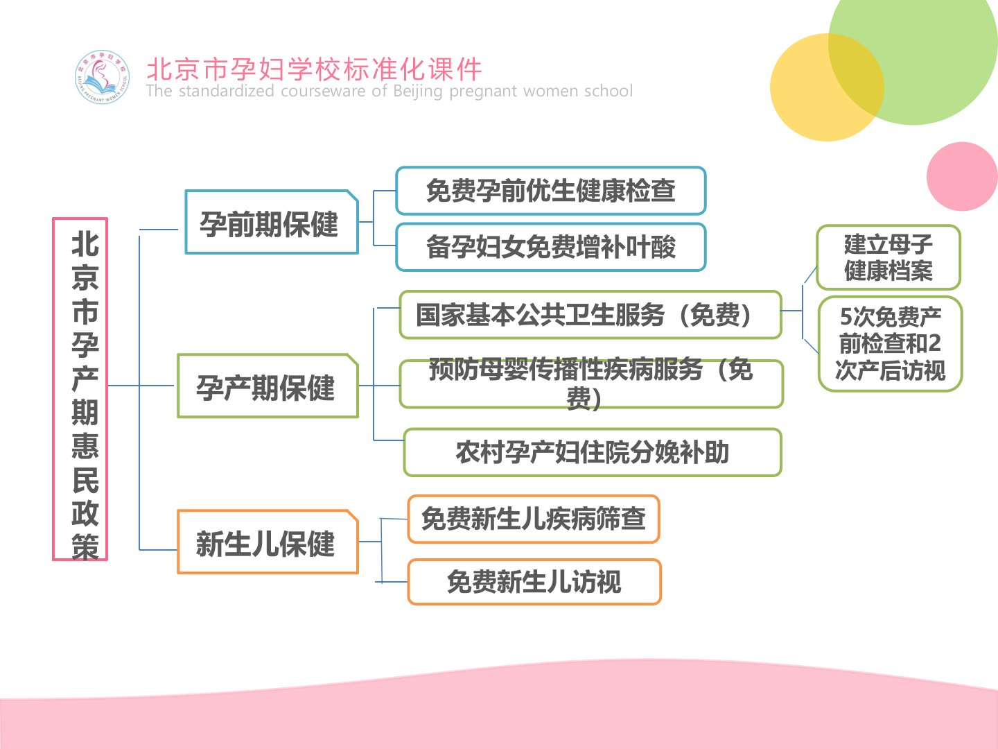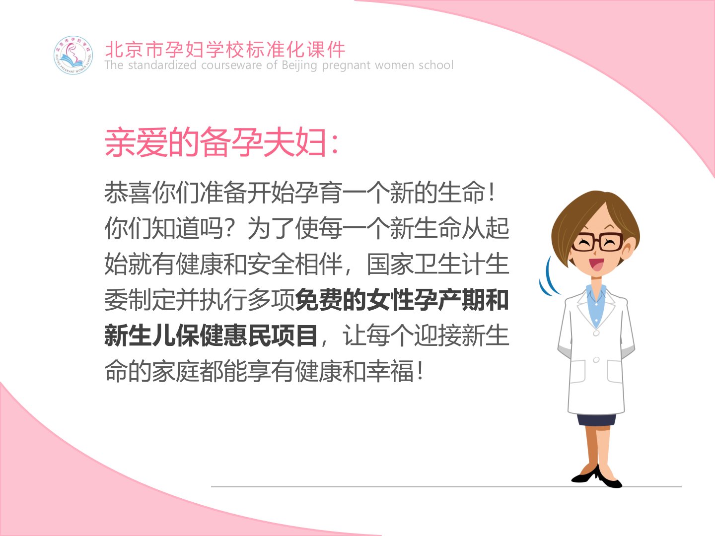 《北京市孕妇学校标准化课件》第1课介绍了北京市孕产期相关政策。首先国家卫生计生委制定多项免费的女性孕产期和新生儿保健惠民项目让每个家庭都能享有健康和幸福。孕前期保健项目方面提供免费孕前优生健康检查和备孕妇女免费增补叶酸服务。叶酸从怀孕前3个月开始补充持续整个孕期可降低神经管畸形等危险。孕产期保健项目方面本市居住的孕产妇包括常住人口可免费建立母子健康档案享受5次免费产前检查和2次产后访视农村孕产妇住院分娩也有补助。此外还免费提供预防母婴传播性疾病服务。新生儿保健项目方面北京市为新生儿提供免费疾病筛查包括先天性听力异常、先天性甲状腺功能低下、先天性心脏病等5项先天性疾病筛查以及耳聋基因免费筛查。筛查结果一般会以短信形式告知家长异常者会电话通知。产妇分娩后还可享受2次免费新生儿及产妇访视服务。