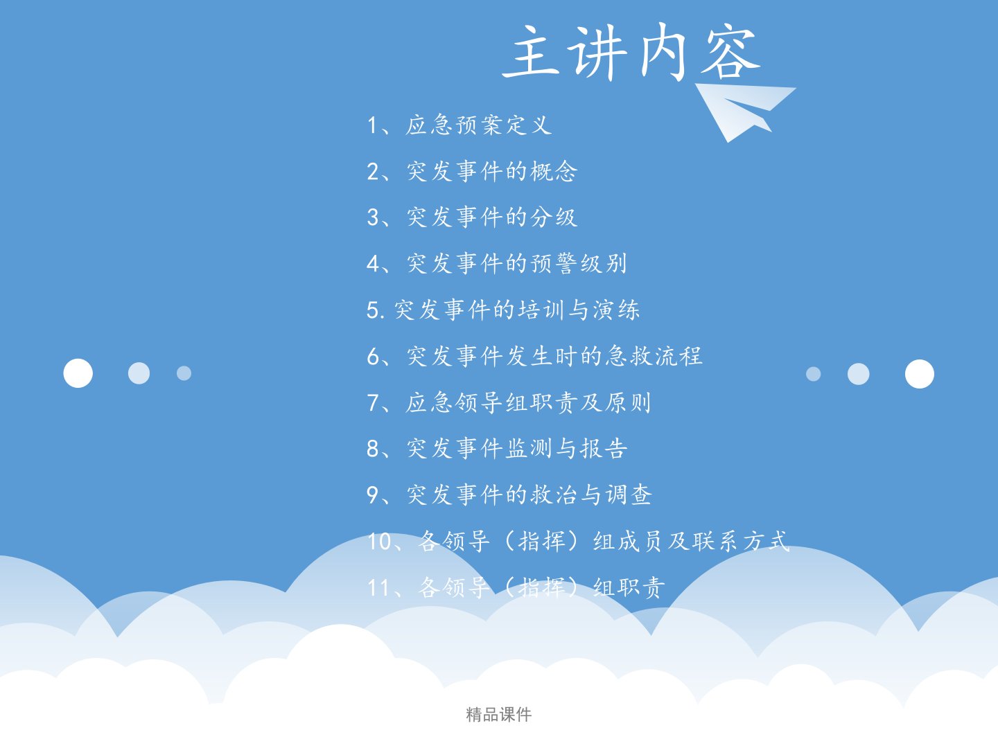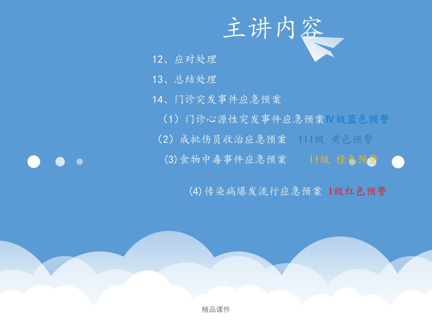 《突发公共卫生事件应急预案》摘要本课件详细阐述了医院在面对各类突发公共卫生事件时的应急处理机制内容涵盖多个方面:1应急预案与突发事件定义:明确了应急预案是医院应对突发事件的行动方案旨在快速处置、降低危害。同时界定了突发公共卫生事件及灾害性、社会治安事件的范围。2分级与预警:将突发事件分为一般、较大、重大、特大四类并设定蓝、黄、橙、红四级预警以应对不同级别的紧急情况。3培训与演练:要求各职能部门制定措施、编写材料、组织培训并制定模拟演习计划以提高应急反应能力。4应急组织与职责:成立了应急领导组及多个工作小组如医疗护理救护组、后勤保障组等明确了各组的职责和任务。5监测与报告:强调开展巡视监测建立登记管理制度确保信息及时上报并规范了信息发布流程。6救治与调查:规定了突发事件发生后的调查处理、伤病员救治、自救疏散等措施。7应对与总结:明确了应对处理的流程和总结处理机制包括追查起因、评估预案、总结教训、表彰奖励及处罚措施。8专项预案:针对门诊心源性突发事件、成批伤员收治、食物中毒、传染病爆发等特定场景制定了详细的应急预案和预警级别。
