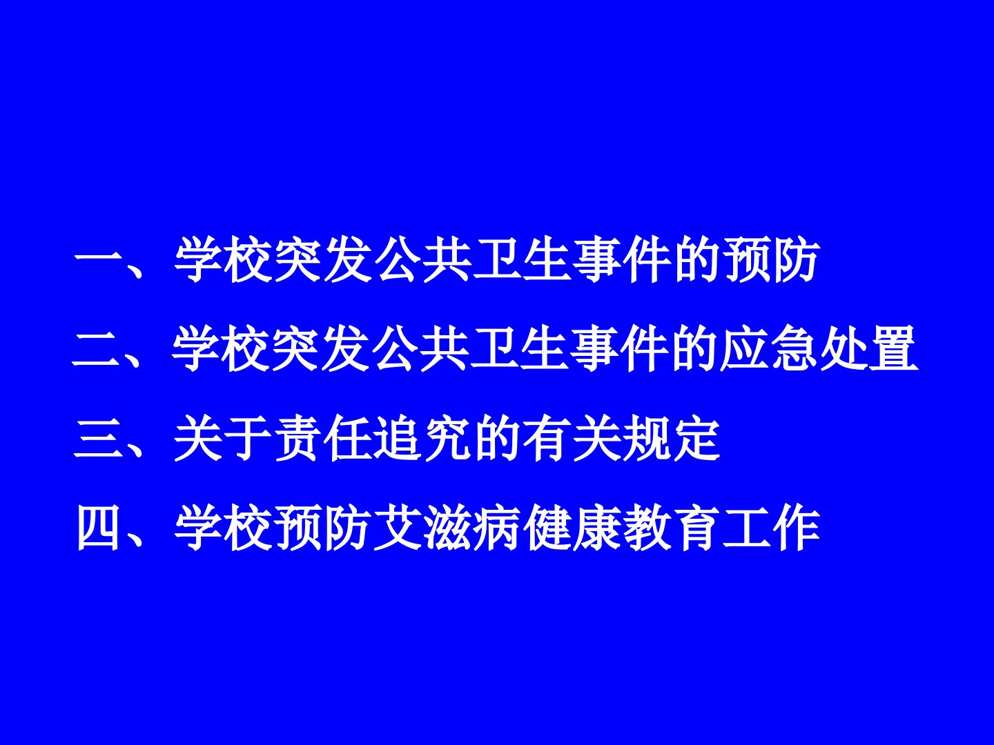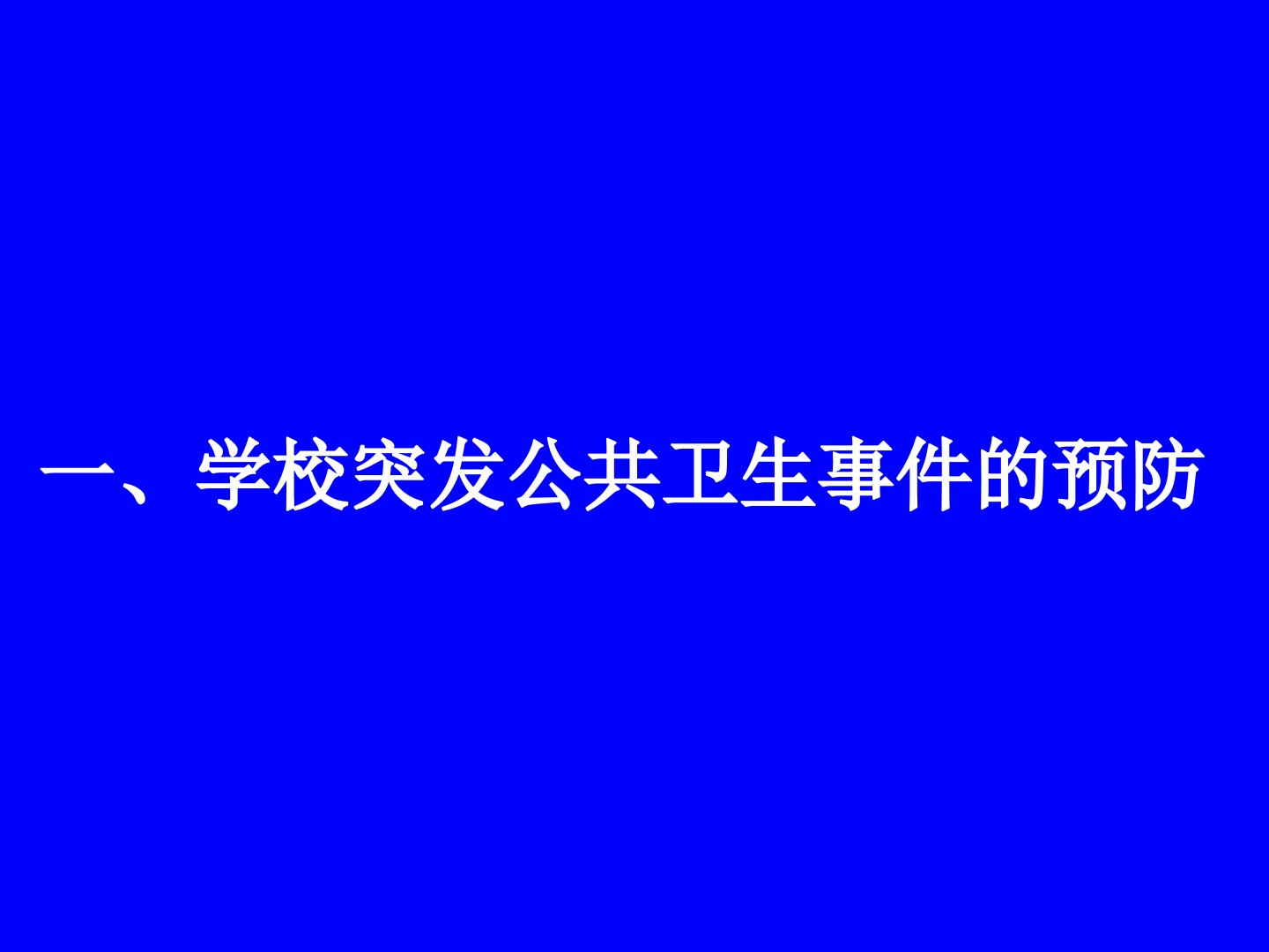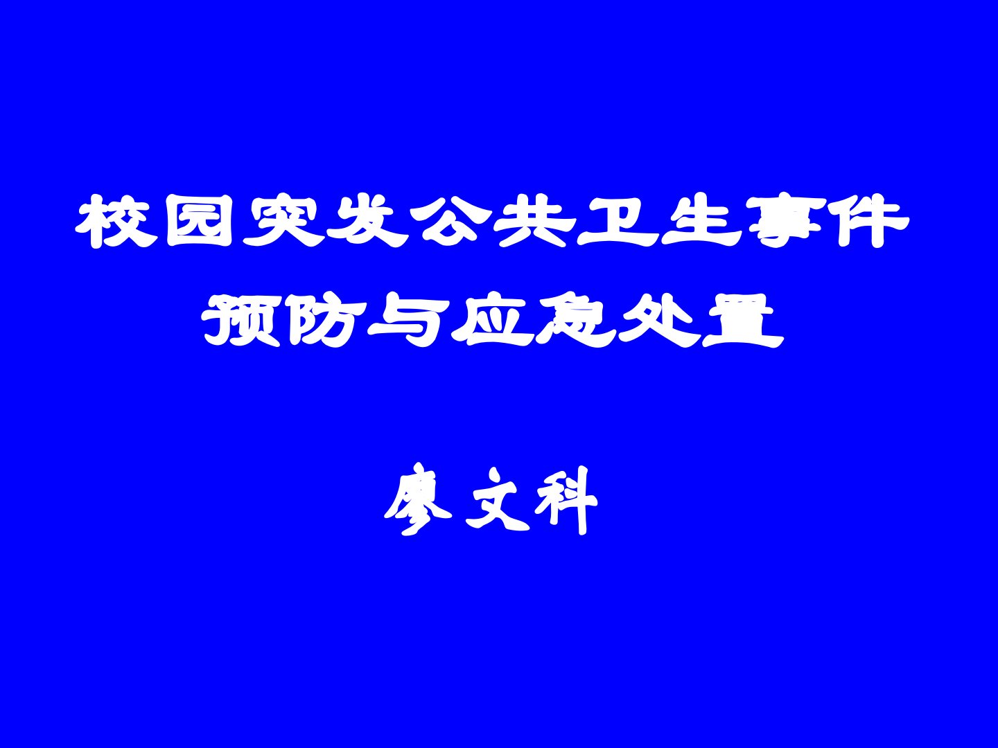 校园突发公共卫生事件预防与应急处置廖文科一、学校突发公共卫生事件的预防二、学校突发公共卫生事件的应急处置三、关于责任追究的有关规定四、学校预防艾滋病健康教育工作一、学校突发公共卫生事件的预防学校突发公共卫生事件:主要是指在学校内突然发生,造成或者可能造成师生健康严重损害的重大传染病疫情、食物中毒及其他事件。学校常见的传染病主要有两类:1、呼吸道传染病:流感、腮腺炎、水痘、麻疹、风疹、肺结核等。2、肠道传染病:痢疾、伤寒/副伤寒、甲肝。其中约四分之三是呼吸道传染病。学校常见食物中毒有三类:细菌性食物中毒(2019年占47.0%)化学性食物中毒(2019年占10.3%)有毒动植物中毒(2019年占...