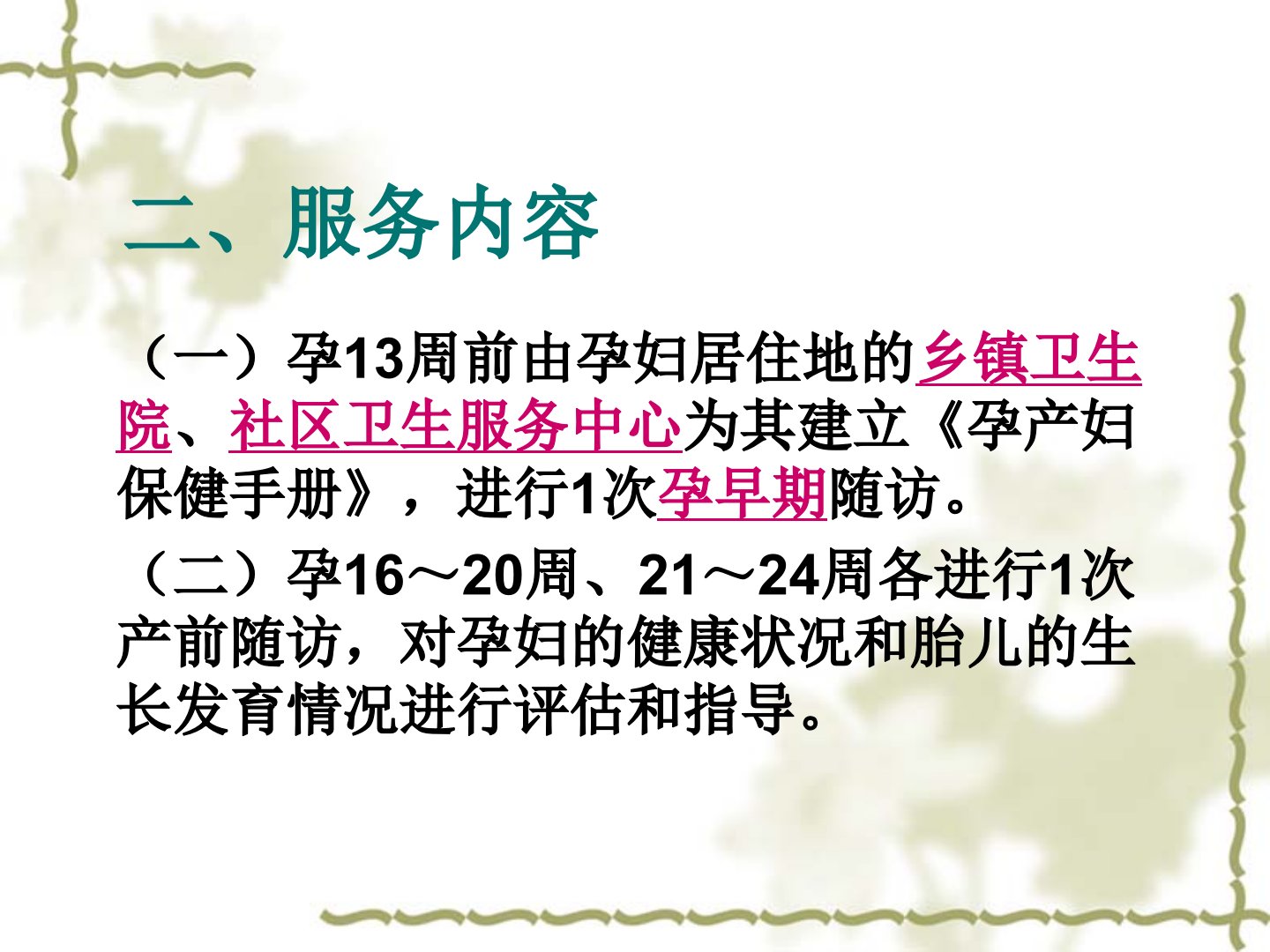 国家基本公共卫生服务规范孕产妇保健摘要国家基本公共卫生服务中孕产妇保健服务对象为辖区内所有孕产妇。服务内容涵盖多个阶段:孕13周前由乡镇卫生院等为孕妇建册并进行1次孕早期随访包括健康评估、保健指导、宣传产前筛查诊断依结果转诊并随访;孕1640周分阶段进行产前随访重症孕妇在有资质机构进行并酌情增次;产后37天内进行访视管理健康指导母乳喂养和新生儿护理。孕检项目多样NT检查可早期诊断婴儿染色体疾病和发现胎儿异常;唐氏筛查查找先天愚型高危个体;B超检查在不同孕周有不同目的;还有血型、梅毒血清学、艾滋病血清学、丙肝病毒等检查。服务要求机构具备设备条件人员有执业资格并接受培训做好信息记录运用中医药方法保健。考核指标包括早孕建册率、产前健康管理率、产后访视率。
