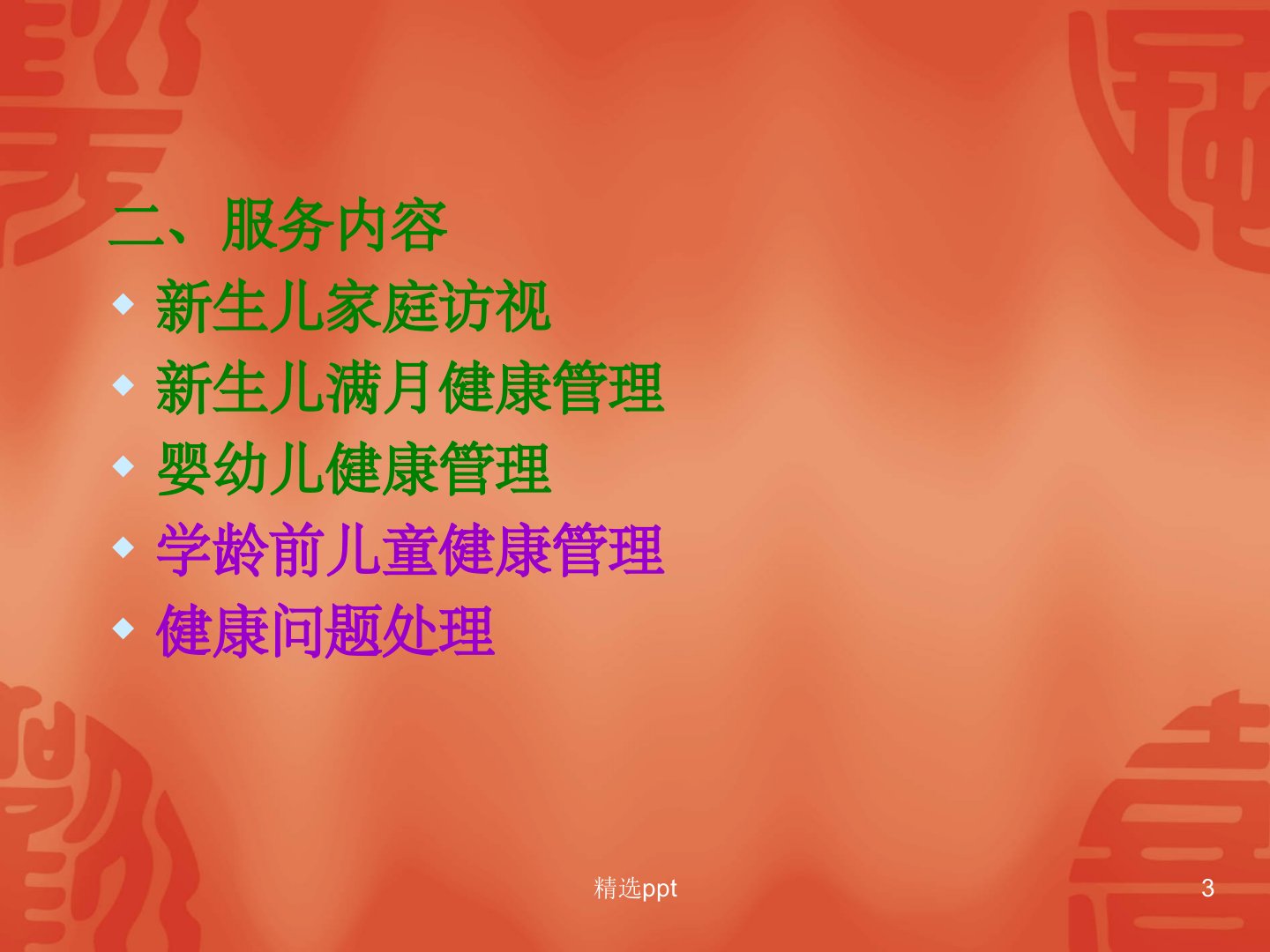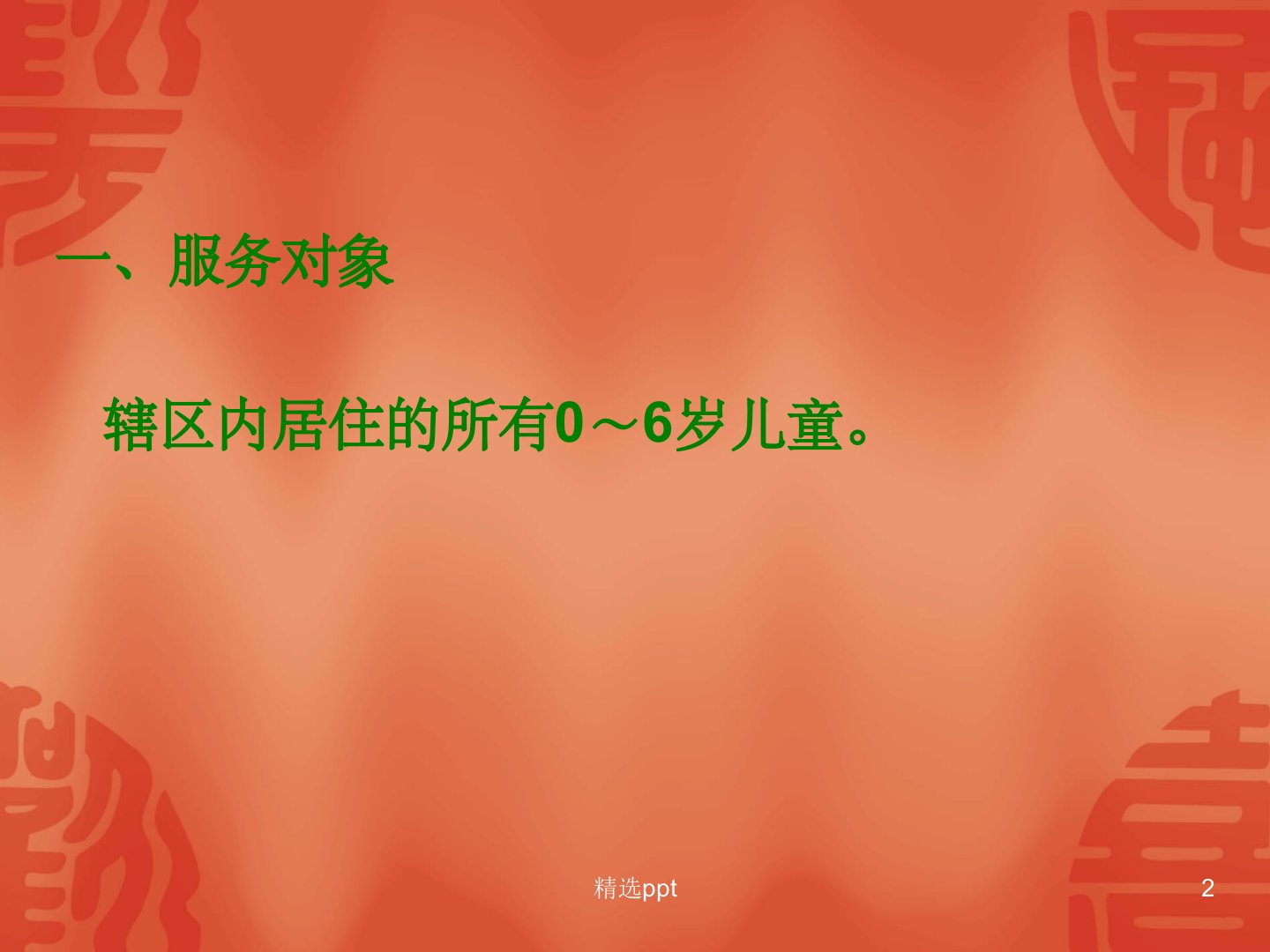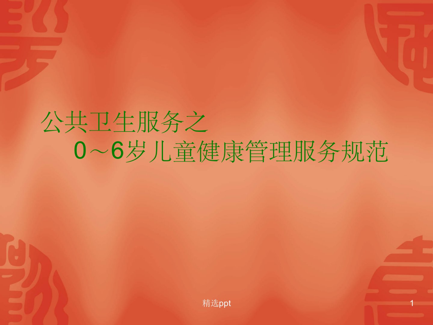 公共卫生服务之0~6岁儿童健康管理服务规范精选ppt一、服务对象辖区内居住的所有0~6岁儿童。精选ppt二、服务内容新生儿家庭访视新生儿满月健康管理婴幼儿健康管理学龄前儿童健康管理健康问题处理精选ppt(一)新生儿家庭访视:新生儿家庭访视:新生儿出院后1周内,保健人员到新生儿家中进行,同时进行产后访视。了解出生时情况、预防接种情况,在开展新生儿疾病筛查的地乡镇了解新生儿疾病筛查情况等。重点询问和观察喂养、睡眠、大小便、黄疸、脐部情况等。为新生儿测量体温、记录其出生时体重、身长,进行体格检查,同时建立《0-6岁儿童保健手册》。精选ppt根据新生儿的具体情况,有针对性地对家长进行母乳喂养、护理和常...