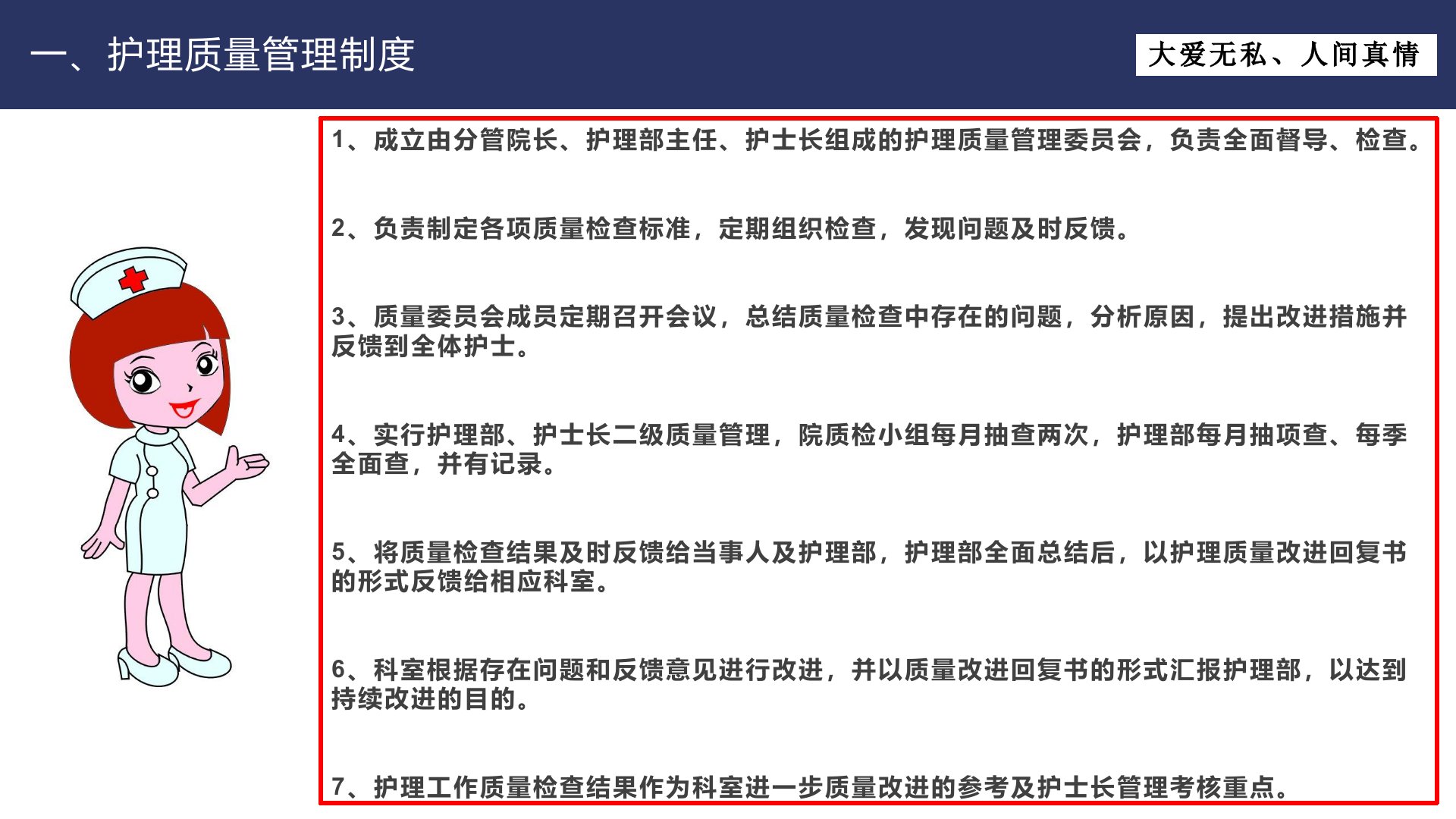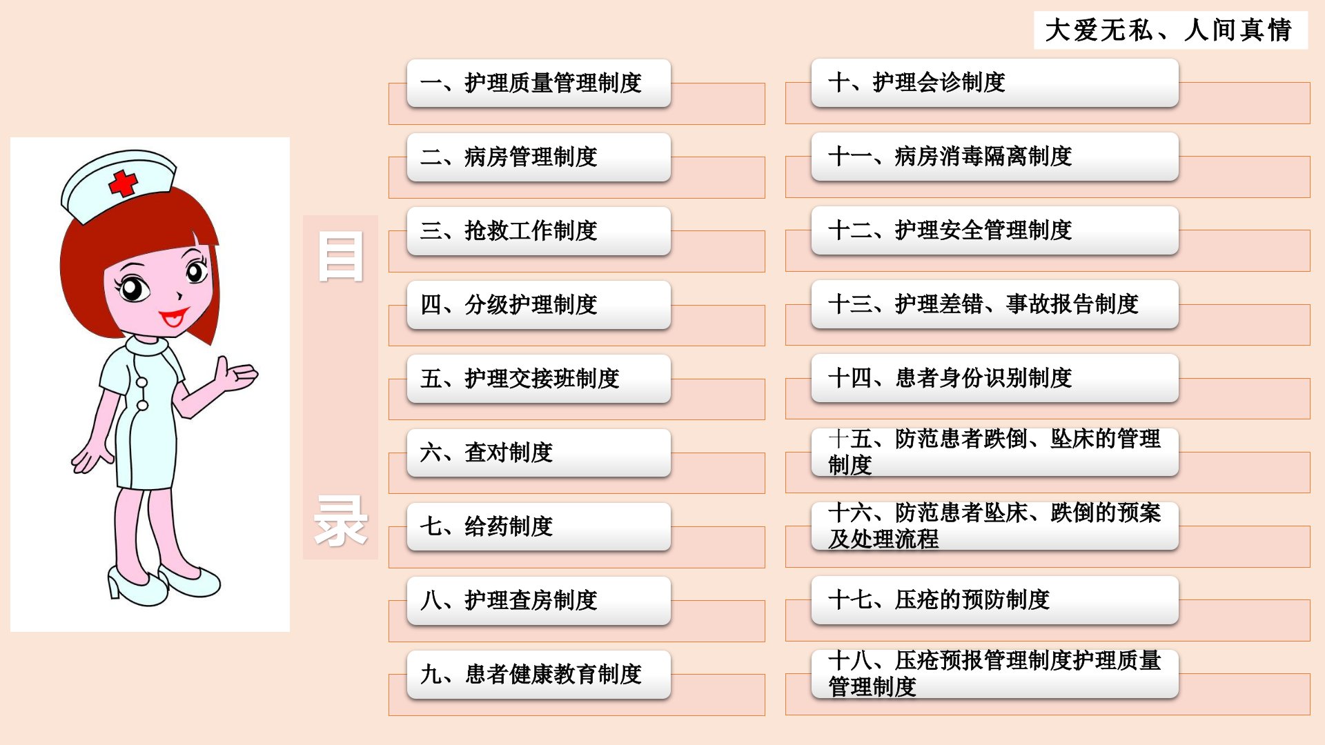 十八项护理核心制度摘要本文详细阐述了医院护理工作的十八项核心制度涵盖护理质量管理、病房管理、抢救工作、分级护理、交接班、查对、给药、护理查房、患者健康教育、护理会诊、消毒隔离、安全管理、差错事故报告、患者身份识别、以及防范患者跌倒、坠床和压疮等多个方面。护理质量管理方面成立护理质量管理委员会制定检查标准定期组织检查并反馈实行二级质量管理检查结果作为质量改进和考核依据。病房管理强调病区整洁、安全统一陈设定期健康教育严格着装和病区准入制度。抢救工作制度明确了抢救的组织、记录、药品器材管理以及医护人员的职责。分级护理制度根据患者病情制定了不同级别的护理要求和指征。交接班制度规定了交接班的时间、内容和责任确保工作的连续性和准确性。查对和给药制度强调了医嘱、服药、注射、输液的查对流程以及用药的安全性和有效性。护理查房包括业务、教学和带教查房旨在提升护理质量和教学水平。患者健康教育制度贯穿于护理全过程包括入院教育、出院指导和集体、文字教育等多种形式。护理会诊制度分为专科护理会诊和疑难病例护理会诊确保复杂病例得到专业处理。消毒隔离制度详细规定了诊疗护理中的无菌操作、环境清洁和医疗废物处理等。护理安全