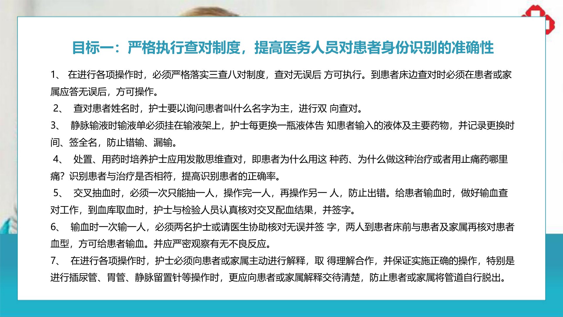 十八项护理核心制度汇报人:卡卡办公护理十大安全目标1、在进行各项操作时,必须严格落实三查八对制度,查对无误后方可执行。到患者床边查对时必须在患者或家属应答无误后,方可操作。2、查对患者姓名时,护士要以询问患者叫什么名字为主,进行双向查对。3、静脉输液时输液单必须挂在输液架上,护士每更换一瓶液体告知患者输入的液体及主要药物,并记录更换时间、签全名,防止错输、漏输。4、处置、用药时培养护士应用发散思维查对,即患者为什么用这种药、为什么做这种治疗或者用止痛药哪里痛?识别患者与治疗是否相符,提高识别患者的正确率。5、交叉抽血时,必须一次只能抽一人,操作完一人,再操作另一人,防止出错。给患者输血时,做好...