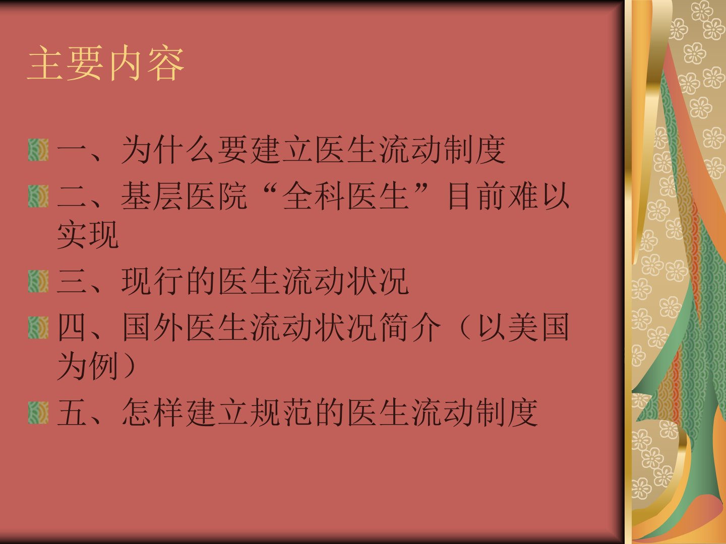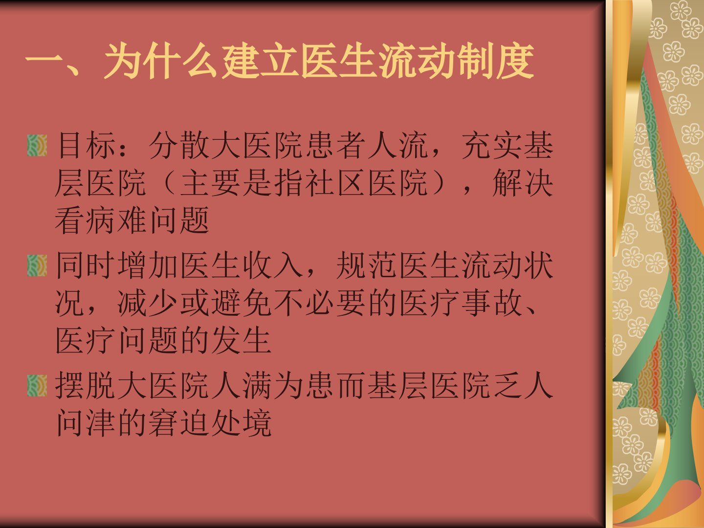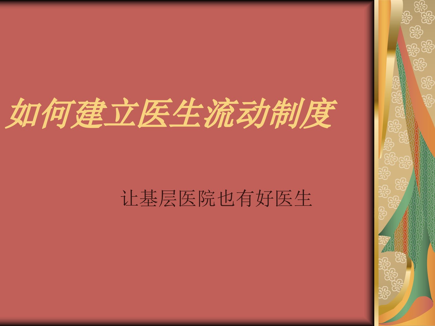如何建立医生流动制度摘要2009年卫生部下发“多点执业”通知明确医师多点执业定义2010年广东作为省级试点开展相关工作。目前基层医院难以实现“全科医生”服务全科医生报考有学历与任职年限要求。当下医生流动存在“走穴”潜规则医生常以会诊名义多点执业规范化流动面临诸多问题如医生责任心、对病人及机构了解程度、医疗事故责任承担等。不过规范化流动好处明显医生可获报酬聘请单位得技术支持患者能获更好救治民营医院尤为欢迎。国外以美国为例医院多不长期聘用医生医生与医院是契约关系多在几个医院兼职且医生流动风险因地域集中、水平差距小易处理。建立规范医生流动制度国家应建合理流动机制规定医生进大医院前基层工作期限;合理规范待遇加大财政支出;医院安排好流动时间、工作量明确三方权责;基层医院明确就诊时间、保证质量、加强设备建设;医生加强自身素质;媒体正确引导医患关系客观报道医疗行业。