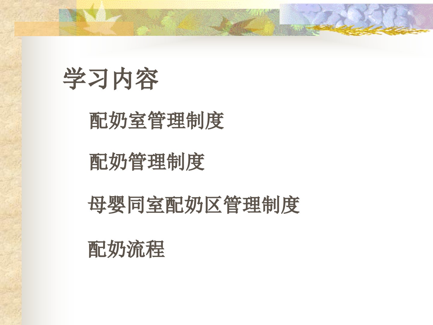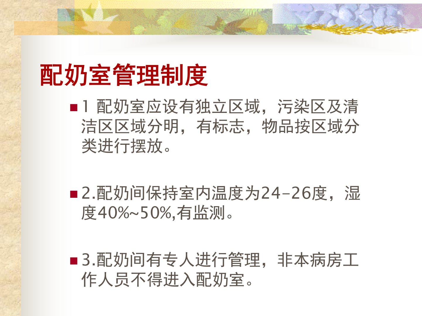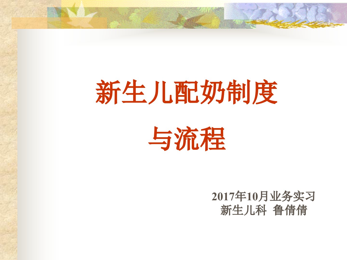新生儿配奶制度与流程2017年10月业务实习新生儿科鲁倩倩学习内容配奶室管理制度配奶管理制度母婴同室配奶区管理制度配奶流程配奶室管理制度1配奶室应设有独立区域,污染区及清洁区区域分明,有标志,物品按区域分类进行摆放。2.配奶间保持室内温度为24-26度,湿度40%~50%,有监测。3.配奶间有专人进行管理,非本病房工作人员不得进入配奶室。4.配奶间应设立洗手装置,进入配奶室需洗手、带帽子及戴口罩。5.每日用含氯消毒液(浓度500mg/L)浸泡过的拖布擦拭地面、物体表面及配奶操作台及操作车两次。如有污染时应及时进行消毒;每次配奶后应清洁操作台面。6.每日开窗通风2次,并进行紫外线消毒房间2次,每...