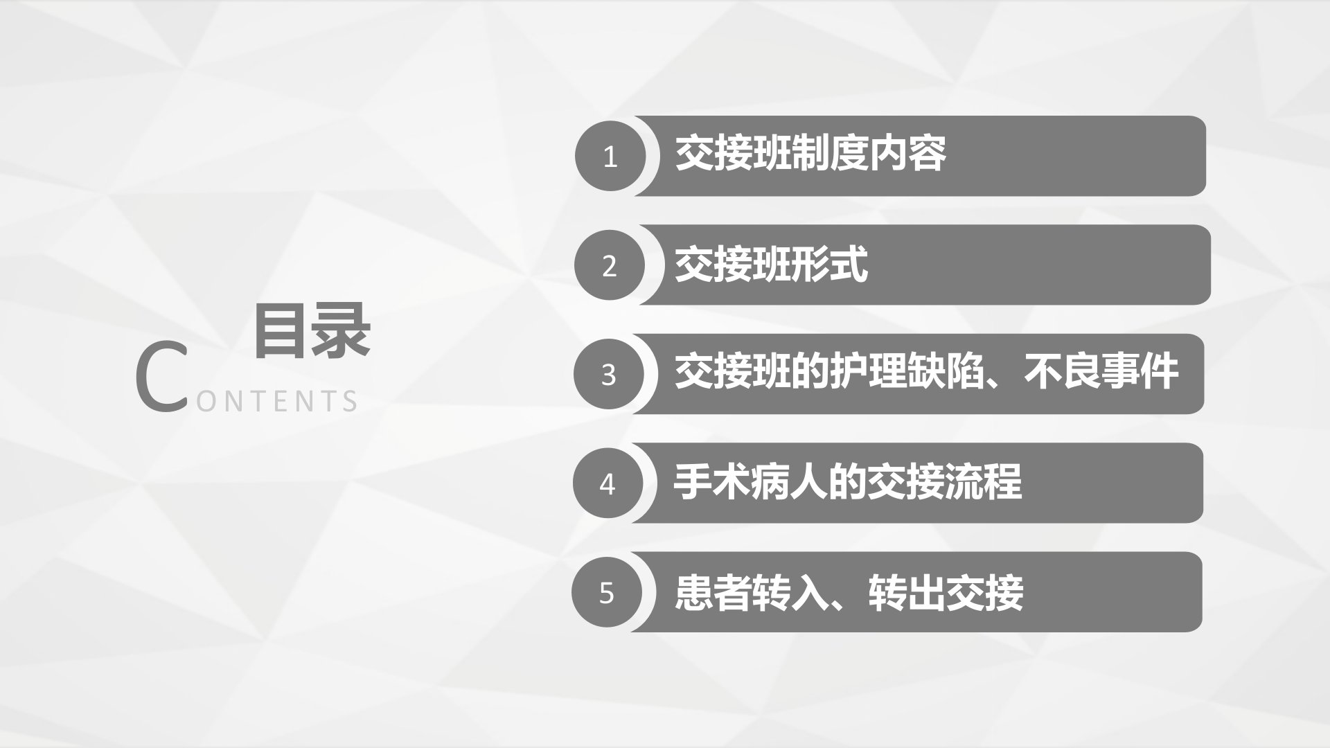 护理交接班制度摘要护理交接班制度是确保病人护理连续性和安全性的重要环节具体内容如下:1交接班制度内容:每日清晨由护士长主持交接班要求参加人员严肃认真。交班护士需报告病人动态尤其关注新入院、危重、手术前后及特殊检查病人。严格执行“四看、五查、一巡视”制度坚持物品交接登记并建立《护理工作备忘录》记录潜在问题与改进措施。2交接班形式:包括共同巡视病房的床头交接班和集体交接。床头交接侧重病情观察、治疗护理等;集体交接则通过护士报告、护士长传达文件等形式进行。3常见护理缺陷与不良事件:如对输液病人观察不到位、床前交接言行不规范、病情评估不足等易引发静脉导管脱出、拔管、皮肤问题等不良事件。4手术病人交接流程:从病区到手术室需核对信息、管道情况;术后返回病区则需准备监护设备、安置体位、监测生命体征等。5患者转入转出交接:转入时需了解病情、准备床位、交接治疗与药物;转出时则联系接收科室、处理医嘱、护送患者并详细交接。