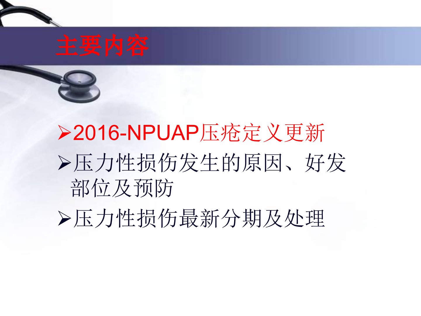 2016年NPUAP将“压力性溃疡”更名为“压力性损伤”并更新了分期。压力性损伤是骨隆突处或医疗器械下的皮肤软组织损伤由压力或剪切力导致微环境、营养等因素会影响其耐受性。新分期用阿拉伯数字表示去除“可疑”一词并将医疗设备相关和粘膜压力性损伤纳入范畴。压力性损伤发生原因包括力学因素、潮湿刺激、使用不当及机体营养不良等好发于受压迫和有骨性突起的部位。预防方面解除局部压力是关键可使用保护器具、摆放合适体位、经常更换体位等。处理上1期用透明贴等敷料710天换药一次;2期根据水泡大小处理贴相应敷料;3、4期一般选用藻酸盐类等敷料封闭治疗联合清创;深部组织损伤要完全减压密切观察;不可分期要清创去除腐肉或焦痂后确定分期。医疗设备相关压力损伤预防要点包括选合适器械尺寸、确保正确位置和护理、定期调整器械定位等。