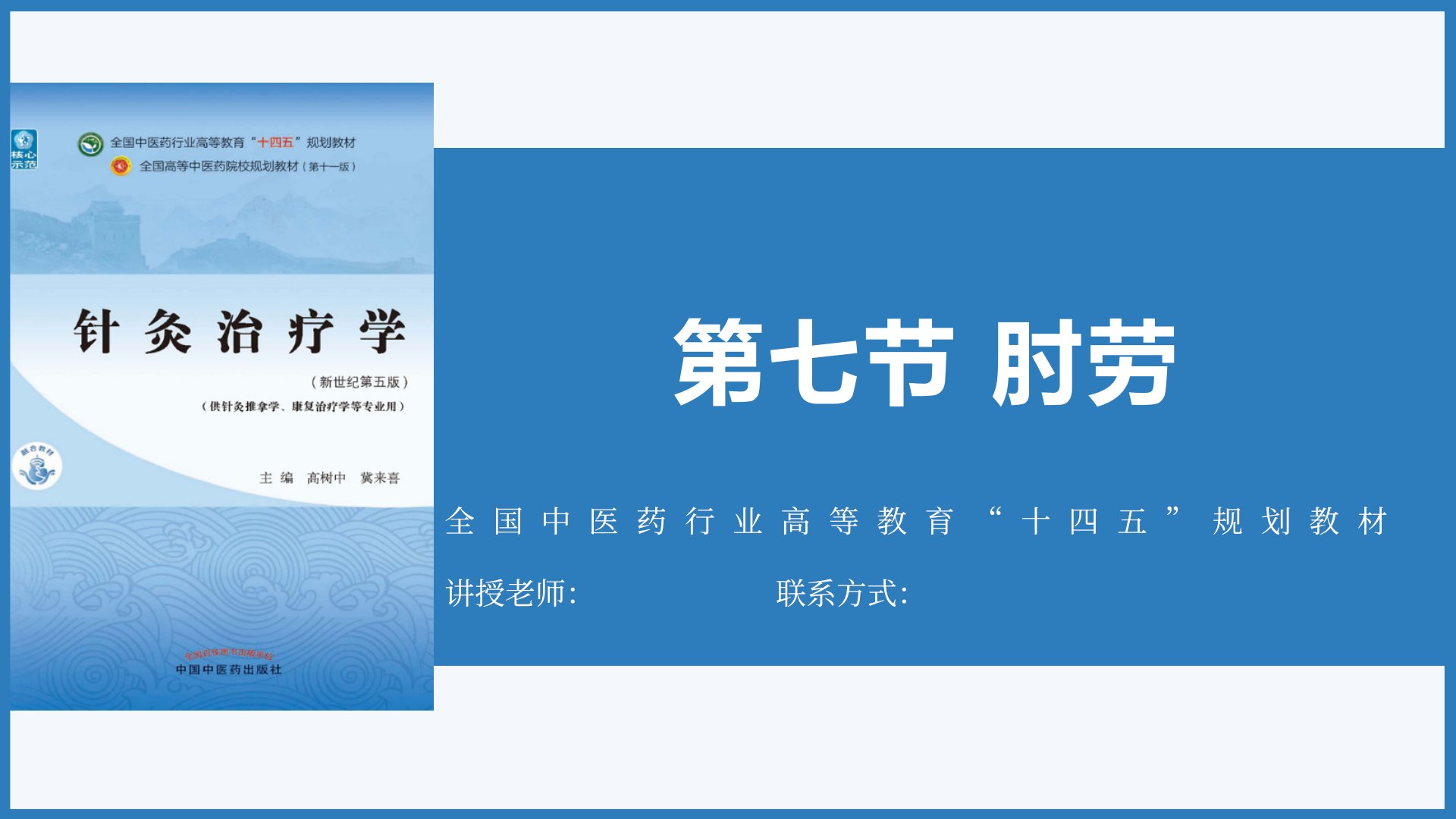 第七节肘劳教学目标为掌握基本治疗、熟悉辨证要点、了解其他治法。病案导入一例46岁黄姓男性患者右侧肘关节疼痛半年余活动受限曾用泼尼松龙封闭无效。查体见右肱骨外上髁稍肿胀压痛明显前臂内、外旋受限不能握拳。肘劳以肘部疼痛为主症属中医“伤筋”“痹病”范畴多见于从事经常旋转前臂和屈伸肘关节的劳动者与慢性劳损有关病位在肘部手三阳经筋基本病机是筋脉不通、气血痹阻。辨证要点包括主症及辨经主症为肘关节活动时疼痛辨经分手阳明经证、手太阳经证、手少阳经证各有明显压痛点。基本治疗以通经活络、舒筋止痛为法取局部穴为主包括主穴和配穴操作采用毫针泻法等。其他治疗包括穴位注射、火针、拔罐、针刀等。针灸治疗肘劳疗效较好急性发作者应避免运动、注意保暖。