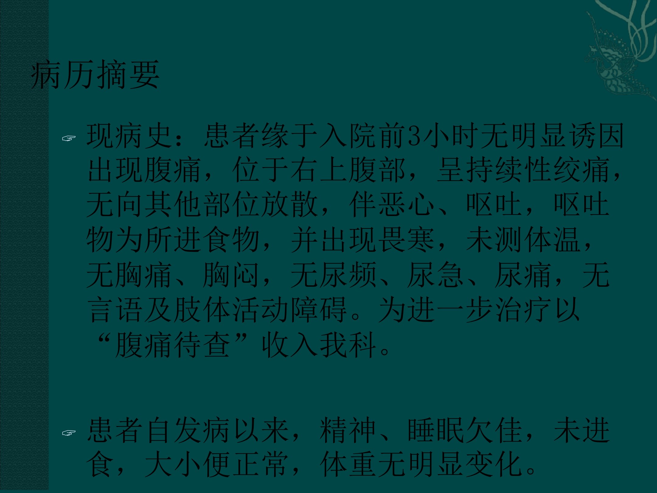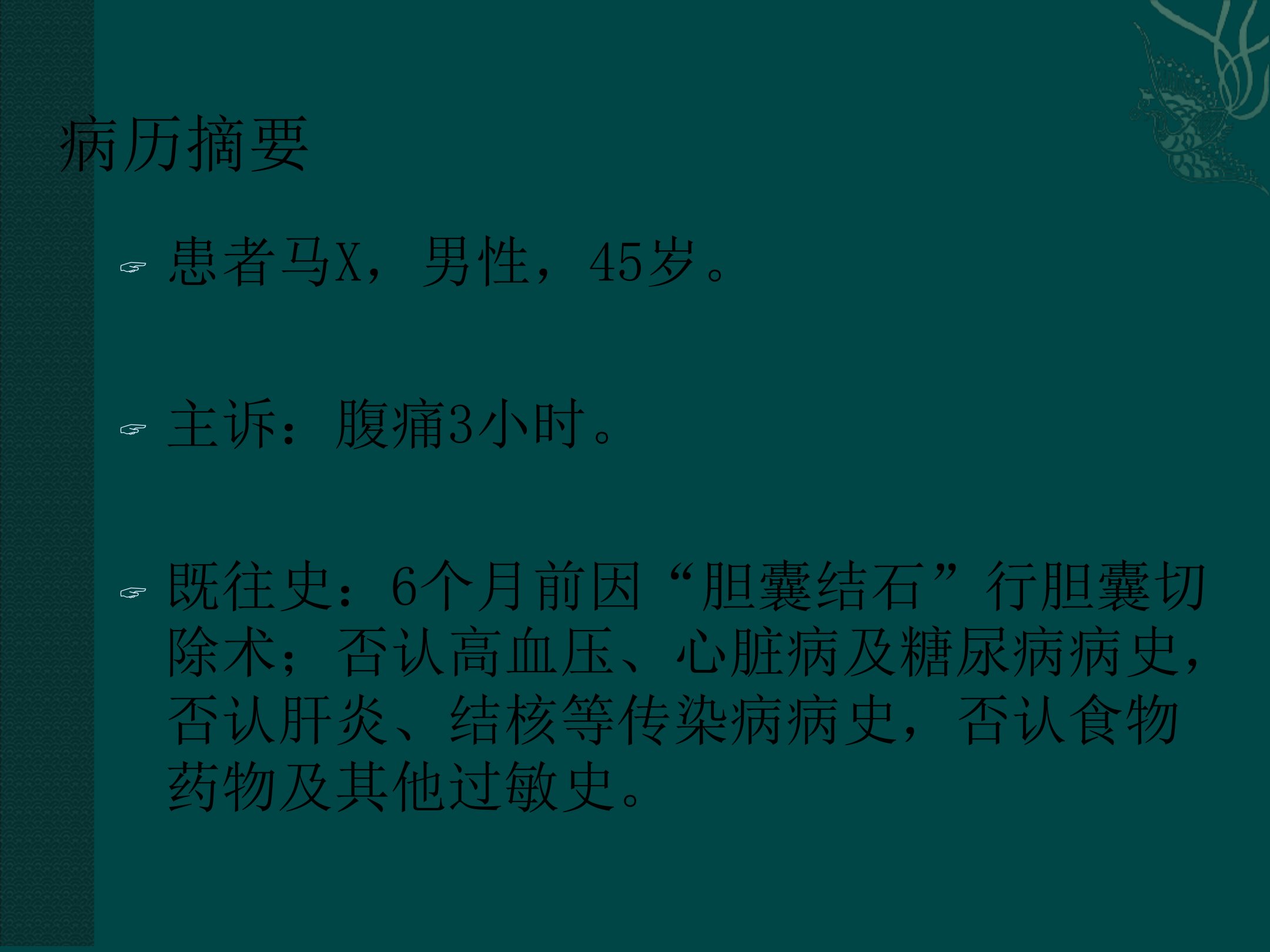 患者马X45岁男性主诉腹痛3小时。患者6个月前行胆囊切除术无其他疾病及过敏史。现病史显示患者入院前3小时无明显诱因出现右上腹持续性绞痛伴恶心、呕吐畏寒但未测体温无其他明显症状以“腹痛待查”收入院。查体示体温略高心率、呼吸、血压正常神志清皮肤巩膜无黄染腹部平坦右上腹压痛明显无反跳痛及肌紧张肝脾未触及。辅助检查显示谷草、谷丙转氨酶总胆红素、直接胆红素、碱性磷酸酶、r谷氨酰转肽酶等指标异常总蛋白、白蛋白指标异常。初步诊断为胆总管结石、急性胆管炎、胆囊切除术后。治疗包括禁食水、抑酸、抗感染、护肝、静脉营养支持及ERCP术术后继续相关治疗并应用药物预防PEP复查肝功同时用熊去氧胆酸保肝利胆预防胆总管结石复发。