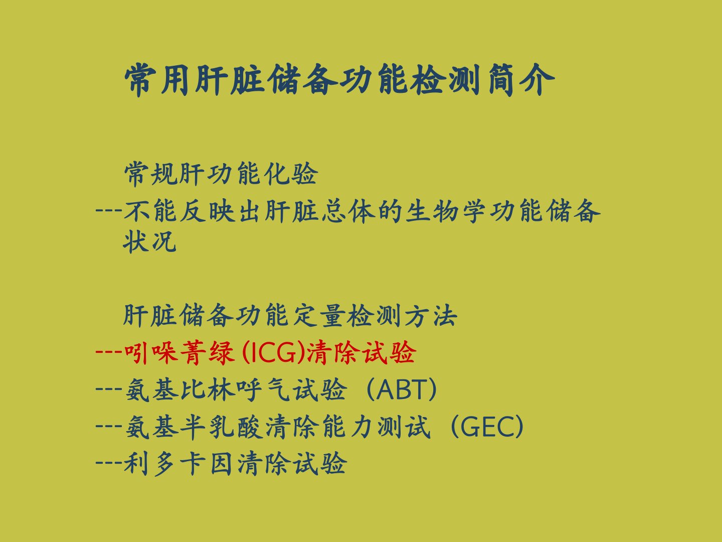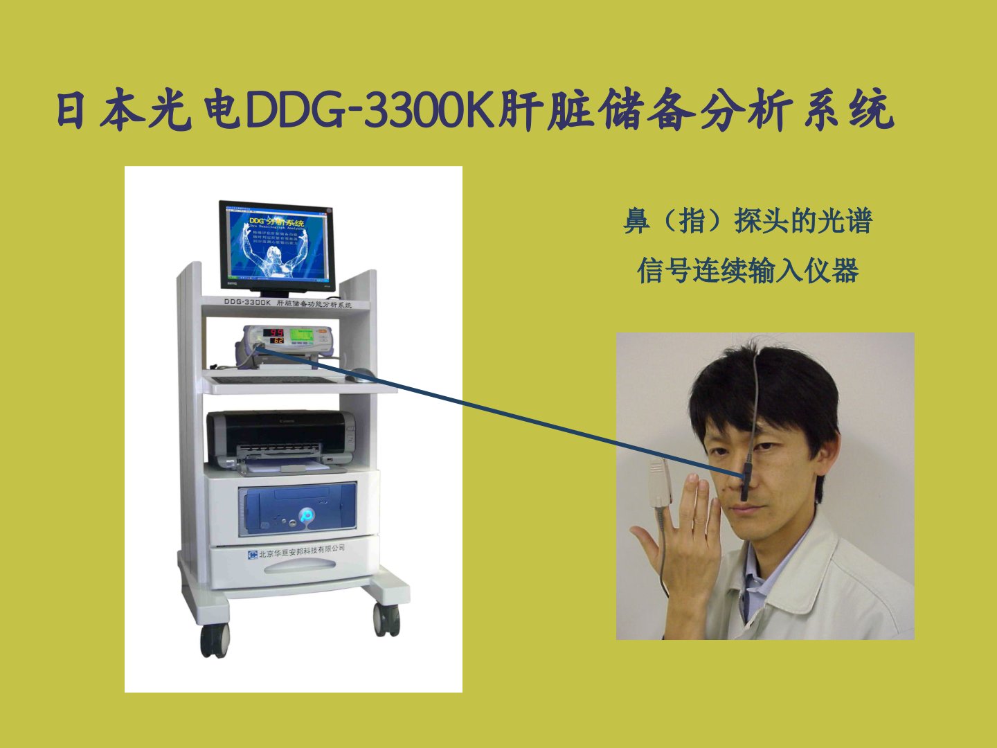 DDG肝脏储备功能分析仪日本光电DDG-3300K肝脏储备分析系统鼻(指)探头的光谱信号连续输入仪器常用肝脏储备功能检测简介常规肝功能化验---不能反映出肝脏总体的生物学功能储备状况肝脏储备功能定量检测方法---吲哚菁绿(ICG)清除试验---氨基比林呼气试验(ABT)---氨基半乳酸清除能力测试(GEC)---利多卡因清除试验吲哚菁绿(ICG)排泄试验检测肝脏储备功能的原理---ICG是一种蓝绿色的染料,有特定的光吸收峰,便于光学测定---注射入血后绝大部分迅速与血浆蛋白结合,半减期很短,没有中间代谢产物,以原型从肝脏排泄,单通道只从肝脏排泄,无肠肝循环---定量注射入血的ICG被肝脏实质细...