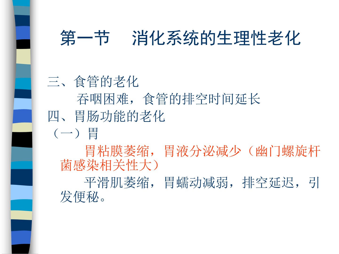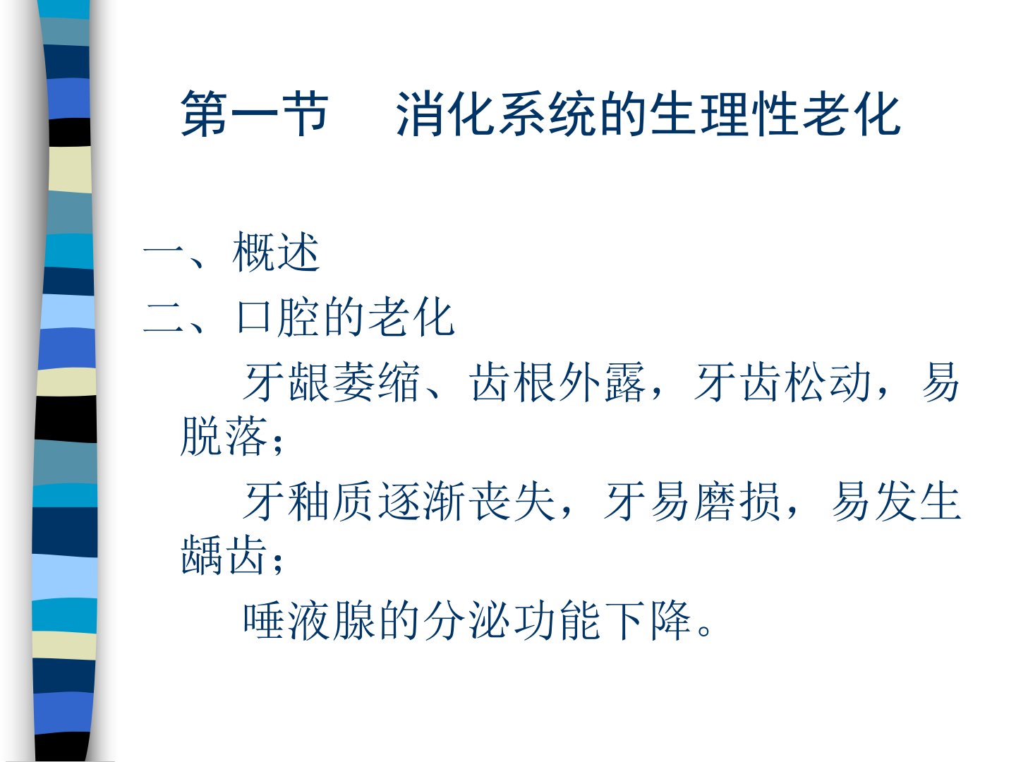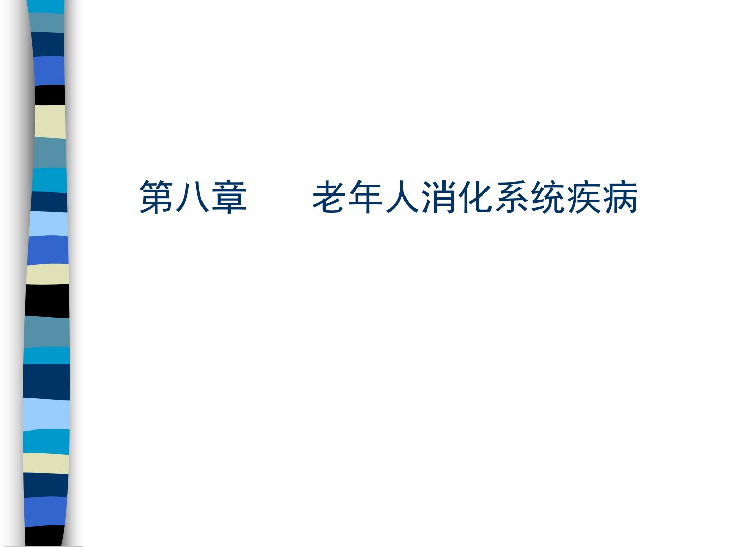 第八章老年人消化系统疾病第一节消化系统的生理性老化一、概述二、口腔的老化牙龈萎缩、齿根外露,牙齿松动,易脱落;牙釉质逐渐丧失,牙易磨损,易发生龋齿;唾液腺的分泌功能下降。第一节消化系统的生理性老化三、食管的老化吞咽困难,食管的排空时间延长四、胃肠功能的老化(一)胃胃粘膜萎缩,胃液分泌减少(幽门螺旋杆菌感染相关性大)平滑肌萎缩,胃蠕动减弱,排空延迟,引发便秘。第一节消化系统的生理性老化四、胃肠功能的老化(二)肠小肠绒毛增宽而短,平滑肌层变薄小肠分泌减少,消化酶水平下降结肠粘膜萎缩,肠蠕动缓慢无力第一节消化系统的生理性老化五、肝、胆、胰的老化(一)肝肝细胞数减少,易造成肝纤维化、硬化肝功能减退,合...