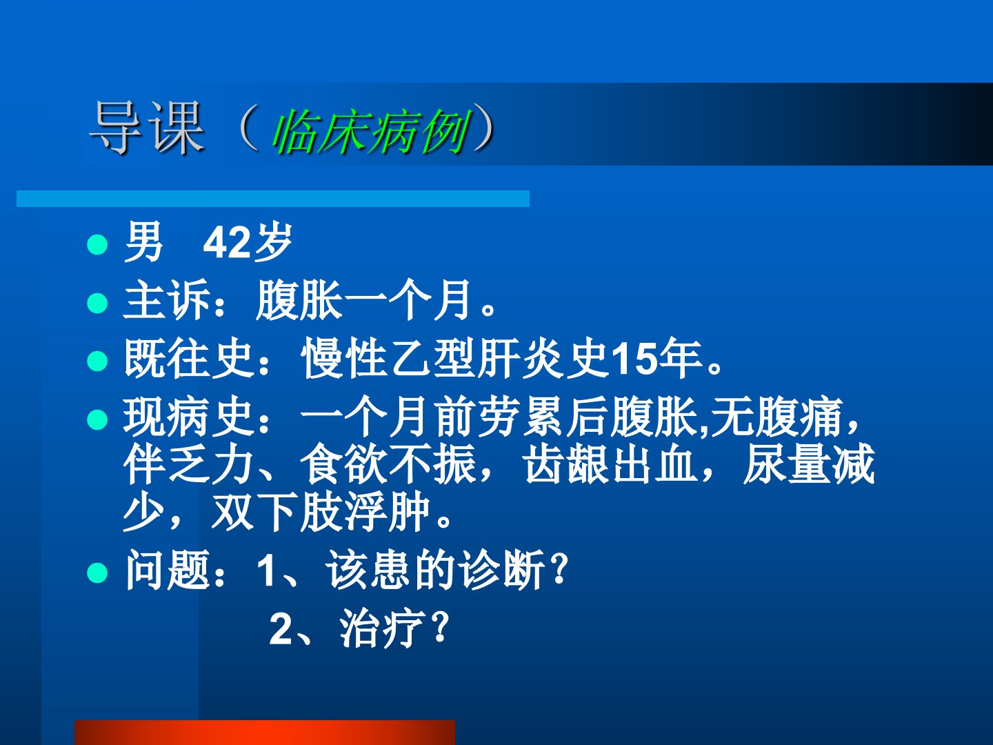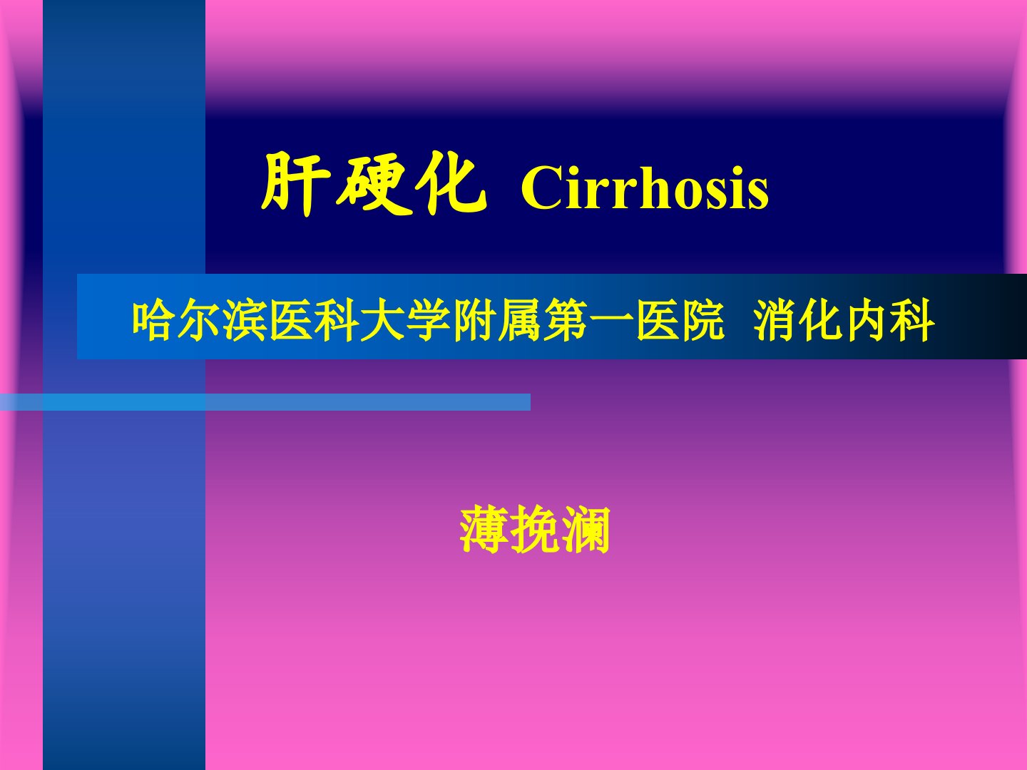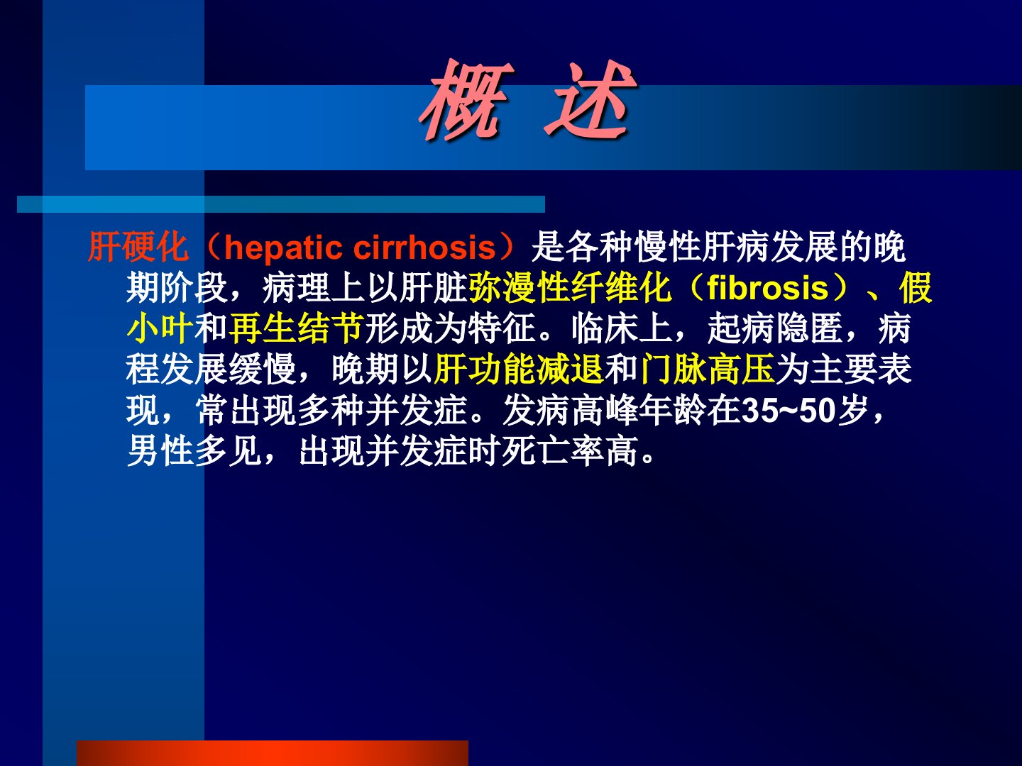 肝硬化Cirrhosis哈尔滨医科大学附属第一医院消化内科薄挽澜导课(临床病例)男42岁主诉:腹胀一个月。既往史:慢性乙型肝炎史15年。现病史:一个月前劳累后腹胀,无腹痛,伴乏力、食欲不振,齿龈出血,尿量减少,双下肢浮肿。问题:1、该患的诊断?2、治疗?概述肝硬化(hepaticcirrhosis)是各种慢性肝病发展的晚期阶段,病理上以肝脏弥漫性纤维化(fibrosis)、假小叶和再生结节形成为特征。临床上,起病隐匿,病程发展缓慢,晚期以肝功能减退和门脉高压为主要表现,常出现多种并发症。发病高峰年龄在35~50岁,男性多见,出现并发症时死亡率高。病毒性肝炎(hepatitis)酒精中毒(欧美多...