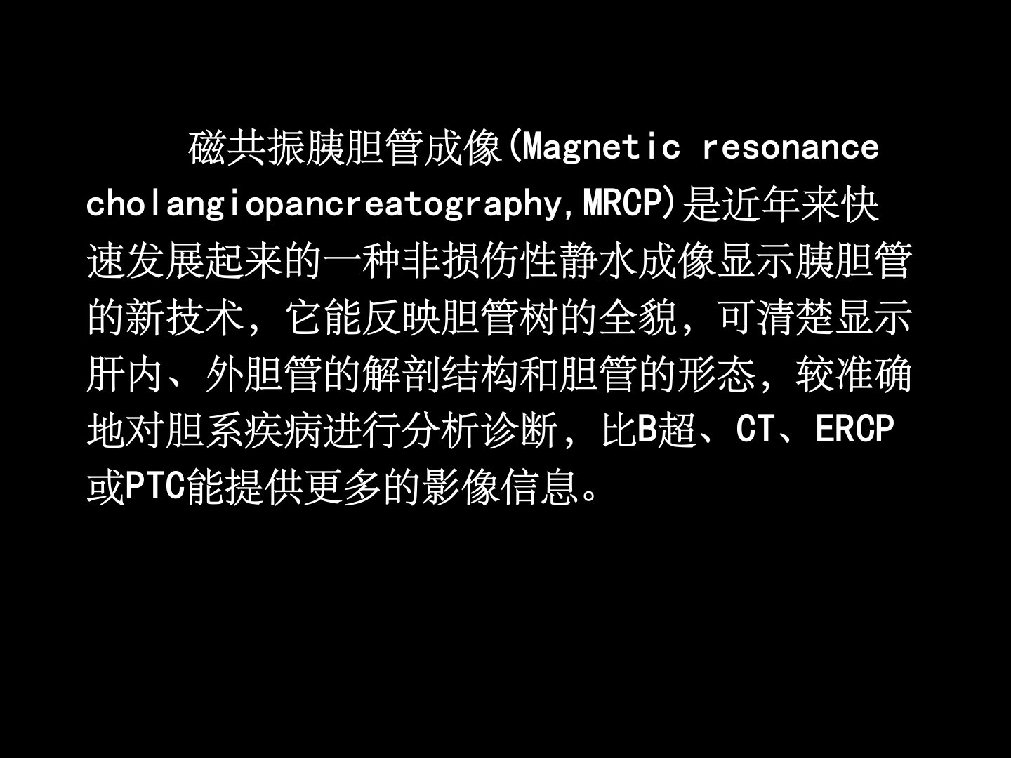 磁共振胰胆管成像(MRCP)是快速发展的非损伤性成像技术可清晰显示肝内外胆管解剖结构为胆系疾病分析诊断提供更多影像信息。MRCP成像技术包括三维或二维连续薄层扫描和二维单层厚层扫描各有优缺点。MRCP可清晰展示正常胆系解剖结构在胆道结石、肿瘤、炎症、损伤及变异以及胰腺肿瘤、炎症及胰管变异的临床应用中价值显著。MRCP对胆道梗阻的诊断意义重大可判断有无梗阻、确定梗阻部位、鉴别梗阻原因和形态。对于胆石症MRCP以优良影像逐步替代单纯诊断性ERCP。MRCP还可清晰显示肝门型及肝外型胆管癌显示梗阻远端胆道情况。此外MRCP在胆系发育异常、胆道损伤诊断中也有重要价值可为临床手术提供直观影像资料也可作为术后疗效随访工具。