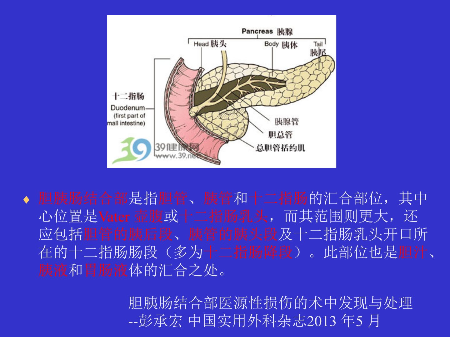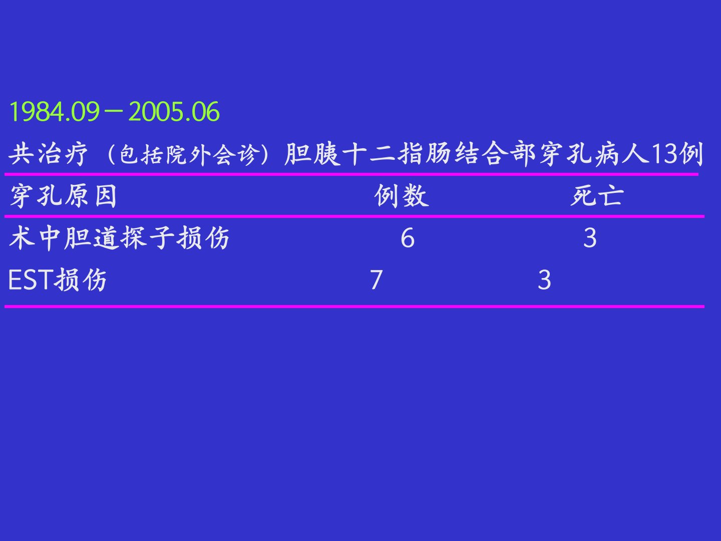 胆胰十二指肠结合部穿孔的处理胆胰肠结合部是胆管、胰管和十二指肠的汇合部位是胆汁、胰液和胃肠液体的汇合之处。胆胰十二指肠结合部穿孔多由医源性损伤导致常见原因包括胆管探查术胆道探子穿通、内镜括约肌切开术(EST)切口过长或前切Precut等。临床表现上胆管十二指肠内瘘常无症状而腹膜后胆胰十二指肠瘘则症状明显包括腹痛、皮下积气、腰痛、呃逆、低烧等严重时可致感染、出血、消化液漏衰竭甚至死亡。诊断方面早期可通过手术探查、不明原因右腰痛、EST后皮下气肿检查及B超、CT等手段进行。处理上一旦确诊应高度重视明确损伤部位和程度后可采用损伤修补术、胆道分流、肠道分流、空肠营养性造口术及腹腔引流等措施。ERCP相关损伤则根据类型采取手术或保守治疗。早期发现、处理得当则预后良好否则极差死亡率高达70。