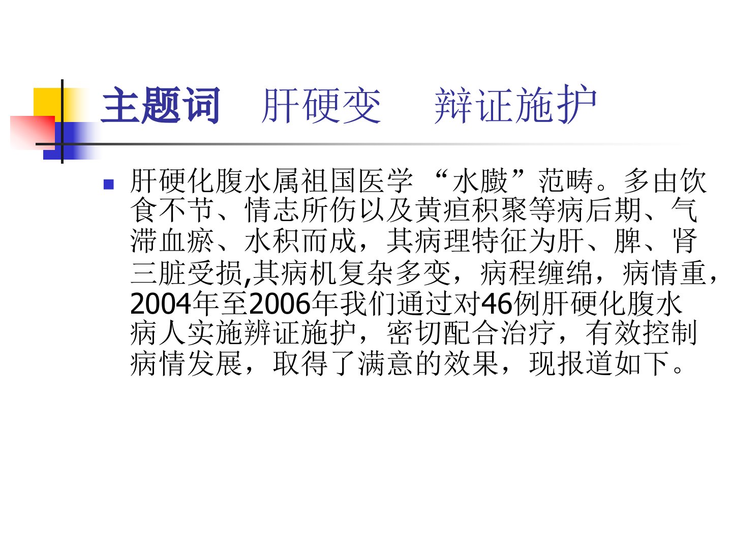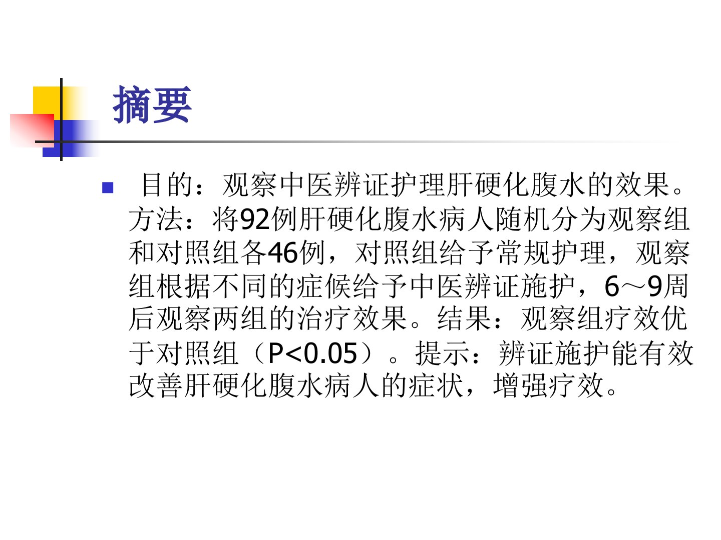 46例肝硬化腹水辨证施护体会摘要目的:观察中医辨证护理肝硬化腹水的效果。方法:将92例肝硬化腹水病人随机分为观察组和对照组各46例对照组常规护理观察组实施中医辨证施护69周后观察疗效。结果:观察组疗效优于对照组(P005)。护理方法上对照组常规护理观察组针对不同症候实施中医辩证护理如气滞湿阻型保证休息、清淡饮食等;寒湿困脾型注意保暖、中药趁热服等。疗效标准依国家中医药管理局标准结果显示观察组总有效率913高于对照组的717。研究表明中医辨证施治可改善肝内微循环促进肝细胞功能恢复中医护理也十分重要。