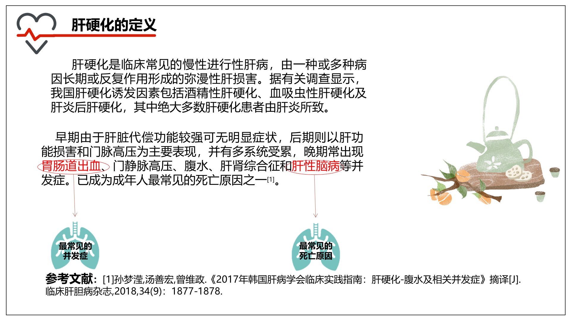 肝硬化患者的营养支持治疗摘要肝硬化是临床常见的慢性进行性肝病由一种或多种病因长期作用形成我国肝硬化患者多由肝炎所致晚期常出现多种并发症是成年人常见死亡原因之一。肝硬化患者常伴有营养不良80100患者存在不同程度营养不良80为蛋白质和(或)能量不足。其营养不良原因多样包括食物摄入减少、营养物质吸收障碍、肝脏功能障碍等。营养支持治疗方面推荐对肝硬化患者进行营养干预不能口服或无法通过经口饮食达到营养目标的患者应采用合适营养干预方式。肠内营养(EN)疗法可改善肝功能、调节蛋白质代谢、缓解肝纤维化。营养支持应根据患者个体情况区别对待在能量、蛋白质、脂肪、葡萄糖摄入及微量营养素与维生素补充方面均有具体要求。饮食方面宜食清淡易消化食物、优质蛋白细嚼慢咽避免坚硬粗糙食物酒精性肝硬化患者应戒酒。营养支持贯穿肝硬化治疗始终需慎重选择营养物质及用量早期肠内营养效果较好。