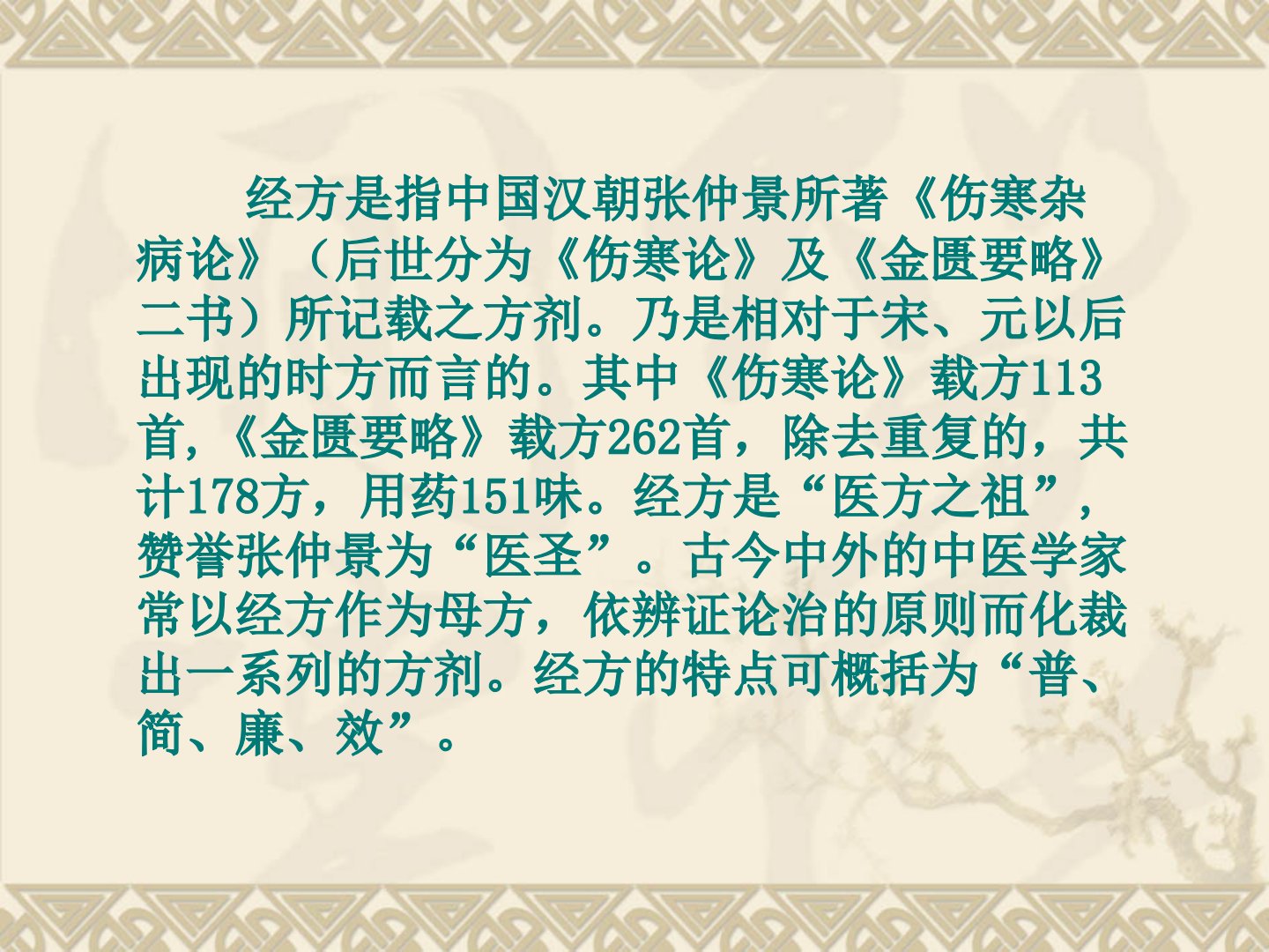 经方在消化系统疾病中的运用冯五金经方是指中国汉朝张仲景所著《伤寒杂病论》(后世分为《伤寒论》及《金匮要略》二书)所记载之方剂。乃是相对于宋、元以后出现的时方而言的。其中《伤寒论》载方113首,《金匮要略》载方262首,除去重复的,共计178方,用药151味。经方是“医方之祖”,赞誉张仲景为“医圣”。古今中外的中医学家常以经方作为母方,依辨证论治的原则而化裁出一系列的方剂。经方的特点可概括为“普、简、廉、效”。消化性溃疡1概述消化性溃疡是指发生在上消化道,与胃酸/胃蛋白酶的消化作用相关的溃疡性病变。也可发生于胃–空肠吻合口附近及含有胃黏膜的Meckel室内。中医关于本病的论述,散见于“胃脘痛”“...
