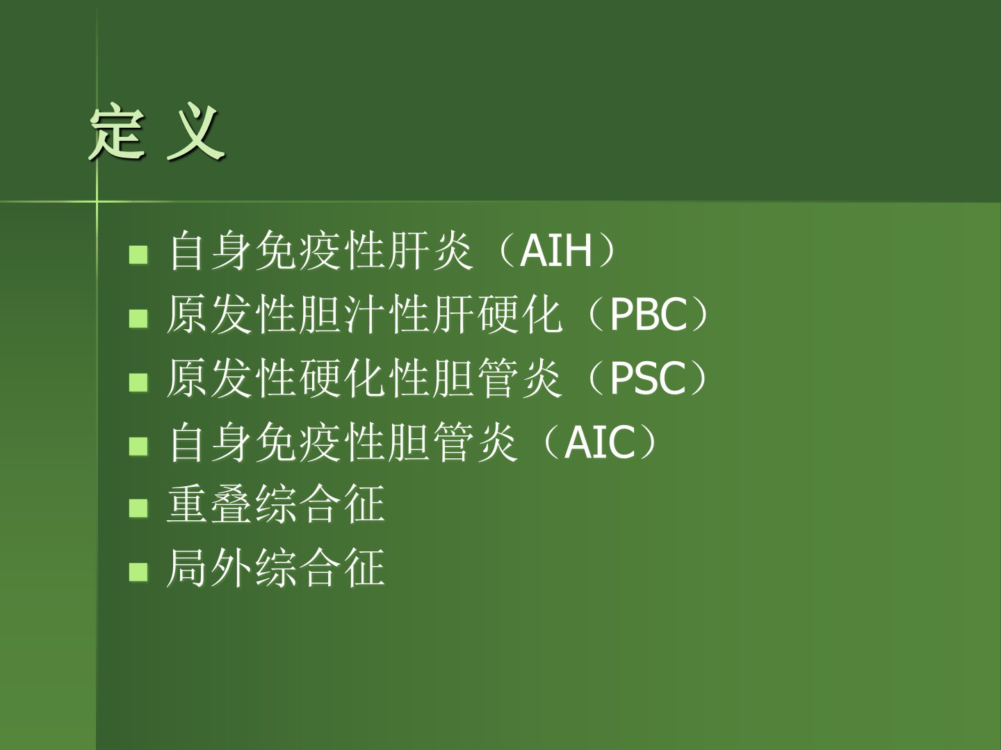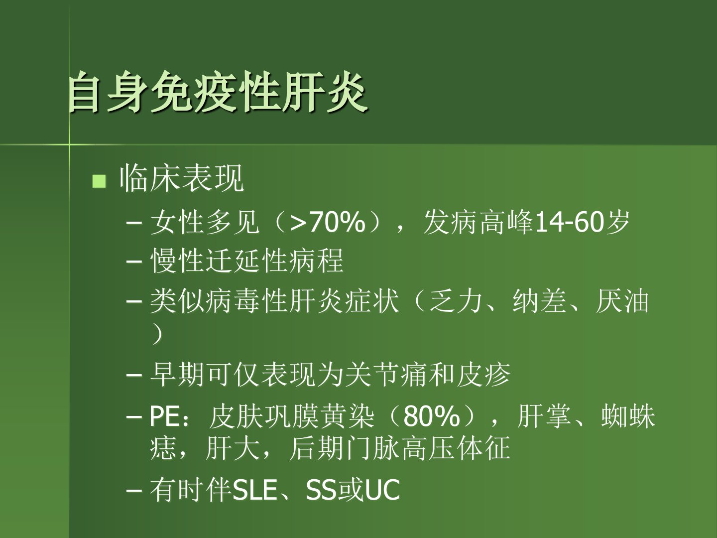 自身免疫性肝病包括自身免疫性肝炎(AIH)、原发性胆汁性肝硬化(PBC)、原发性硬化性胆管炎(PSC)等。AIH女性多见发病高峰1460岁症状类似病毒性肝炎实验室检查见肝酶升高、高球蛋白血症及特定自身抗体阳性病理为淋巴细胞性碎屑样坏死治疗用激素和免疫抑制剂。PBC早期症状为瘙痒中晚期出现肝硬化实验室检查见ALP等肝酶升高IgM增高为主AMA阳性率高病理为肉芽肿性胆管炎治疗包括对症及免疫治疗。PSC男性多见常伴胆系感染和IBD实验室检查类似PBC影像学见胆管多灶性狭窄病理为纤维性胆管炎治疗以肝移植为主确诊后平均生存期12年。重叠综合征指AIH合并PBC或PSC其中AIH合并PBC对激素治疗反应好而AIH合并PSC对激素反应差。对于SS合并胆汁淤积症我国原发SS肝损害多见。