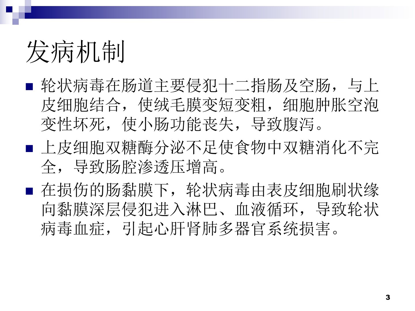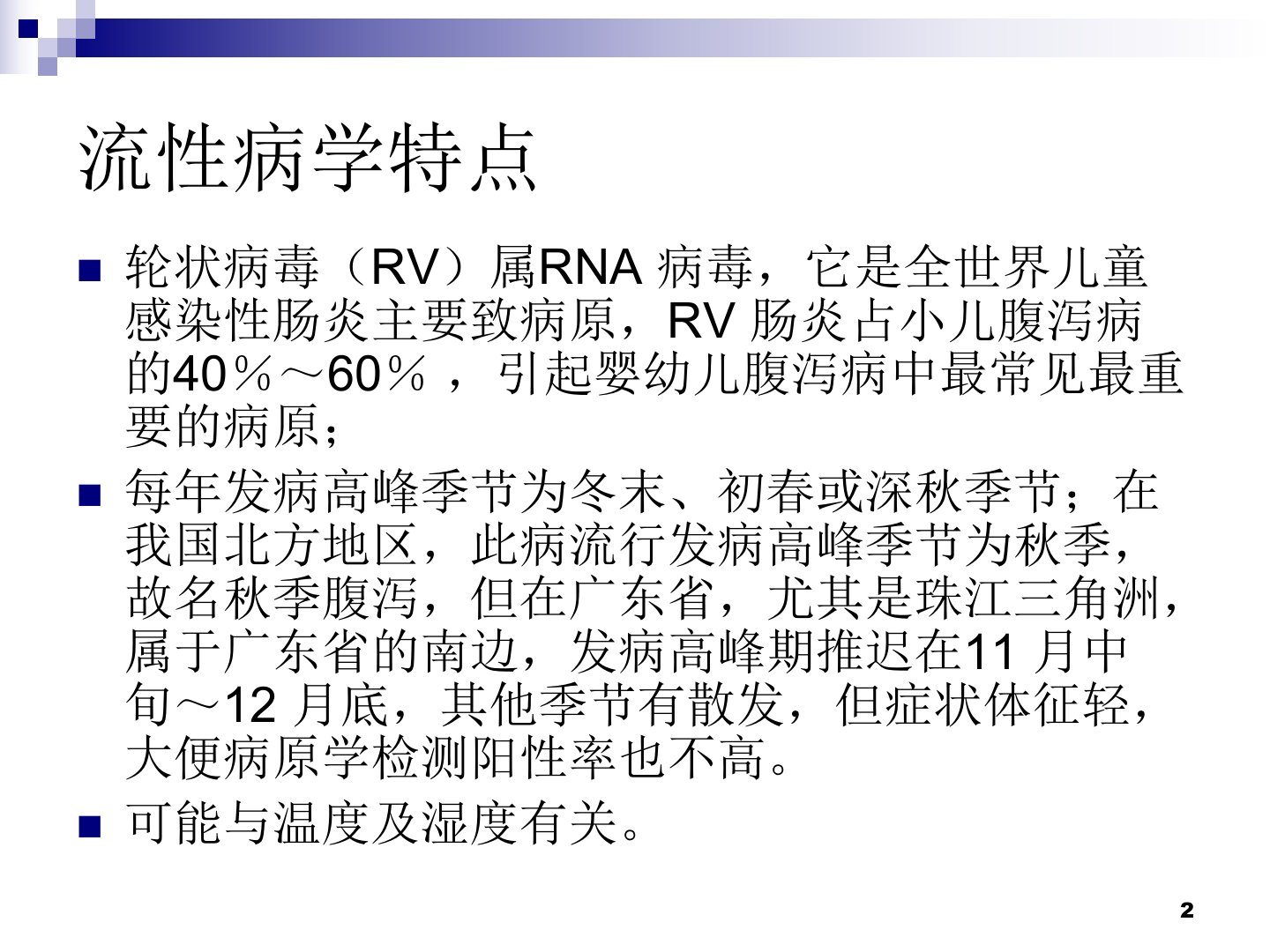 轮状病毒(RV)是儿童感染性肠炎主要致病原占小儿腹泻病的4060发病高峰多为冬末、初春或深秋我国北方秋季高发广东珠江三角洲则推迟至11月中旬到12月底。RV主要侵犯十二指肠及空肠致小肠功能丧失引发腹泻且可通过淋巴、血液循环导致多器官系统损害。6个月至2岁婴幼儿发病率最高与机体内RV特异性抗体消长有关。RV肠炎可致心肌、中枢神经系统、肝胆等损害心肌损害主要表现为精神欠佳预后佳;中枢神经系统损害包括脑炎、脑膜炎等多数预后较好。治疗上营养治疗应尽早给予易于消化吸收的营养均衡食品采用去乳糖饮食意义重大。此外还有液体疗法、病因治疗(如苍苓止泻口服液、中药及干扰素等)、微生态疗法及经皮治疗等多种治疗方式。常见病因包括广谱抗生素的应用和肠道菌群失调微生态制剂可重建生态平衡提高机体抗感染能力。