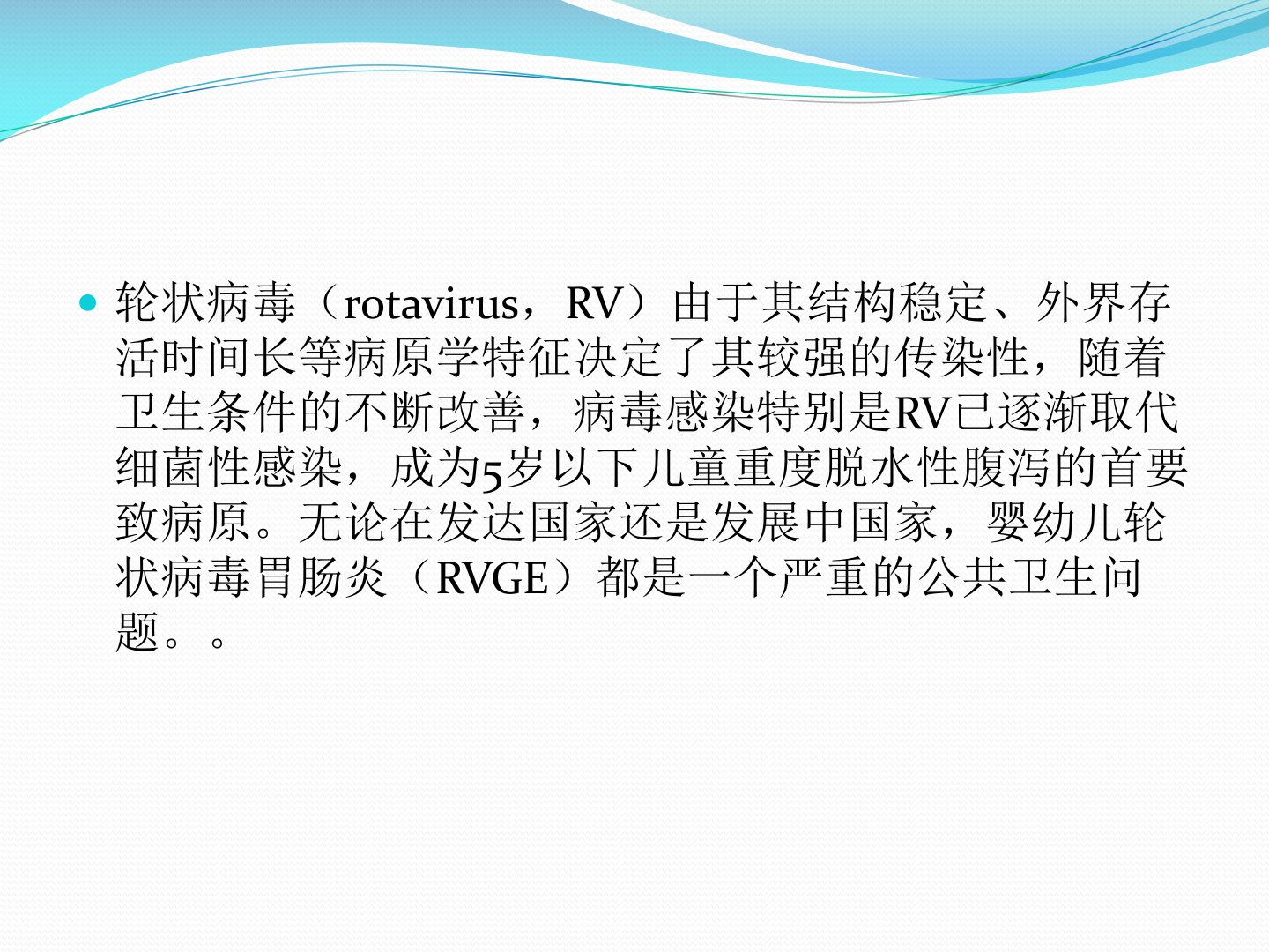 《2020版儿童轮状病毒胃肠炎预防诊疗专家共识》摘要轮状病毒(RV)因其结构稳定、外界存活时间长成为5岁以下儿童重度脱水性腹泻的首要致病原。RV属于呼肠病毒科病毒颗粒为7075nm的二十面体分为AJ群其中A群RV是5岁以下儿童急性水样腹泻最为常见的病原体。传染源主要包括患者、恢复期排毒者和无症状感染者传播途径多样以粪口途径为主人群普遍易感2岁以下婴幼儿是重点预防对象。RVGE全年发病冬季最高约90发生在2岁以下儿童。疾病负担重是全球5岁以下儿童感染性疾病死亡第二大病因。RVGE不仅会导致患儿生长迟缓和低体重还可能引发院内感染、社会心理负担及肠外感染等。临床特征上小月龄婴儿症状以亚临床至轻度为主324月龄幼儿症状典型严重病例可发生高渗性脱水甚至死亡。预防方面国内已上市两种RV疫苗即单价口服轮状病毒活疫苗(LLR)和五价重配轮状病毒减毒活疫苗(RV5)。RV疫苗能有效预防重度RVGE病例的发生且长期保护效果好安全性高。专家共识建议尽早(6周龄)开始常规接种与流行病毒株型别相匹配的RV疫苗。对于早产儿、母乳喂养婴儿等特殊人群也给出了相应的接种建议。治疗方案上目前尚无特效抗RV治疗措施主要以口