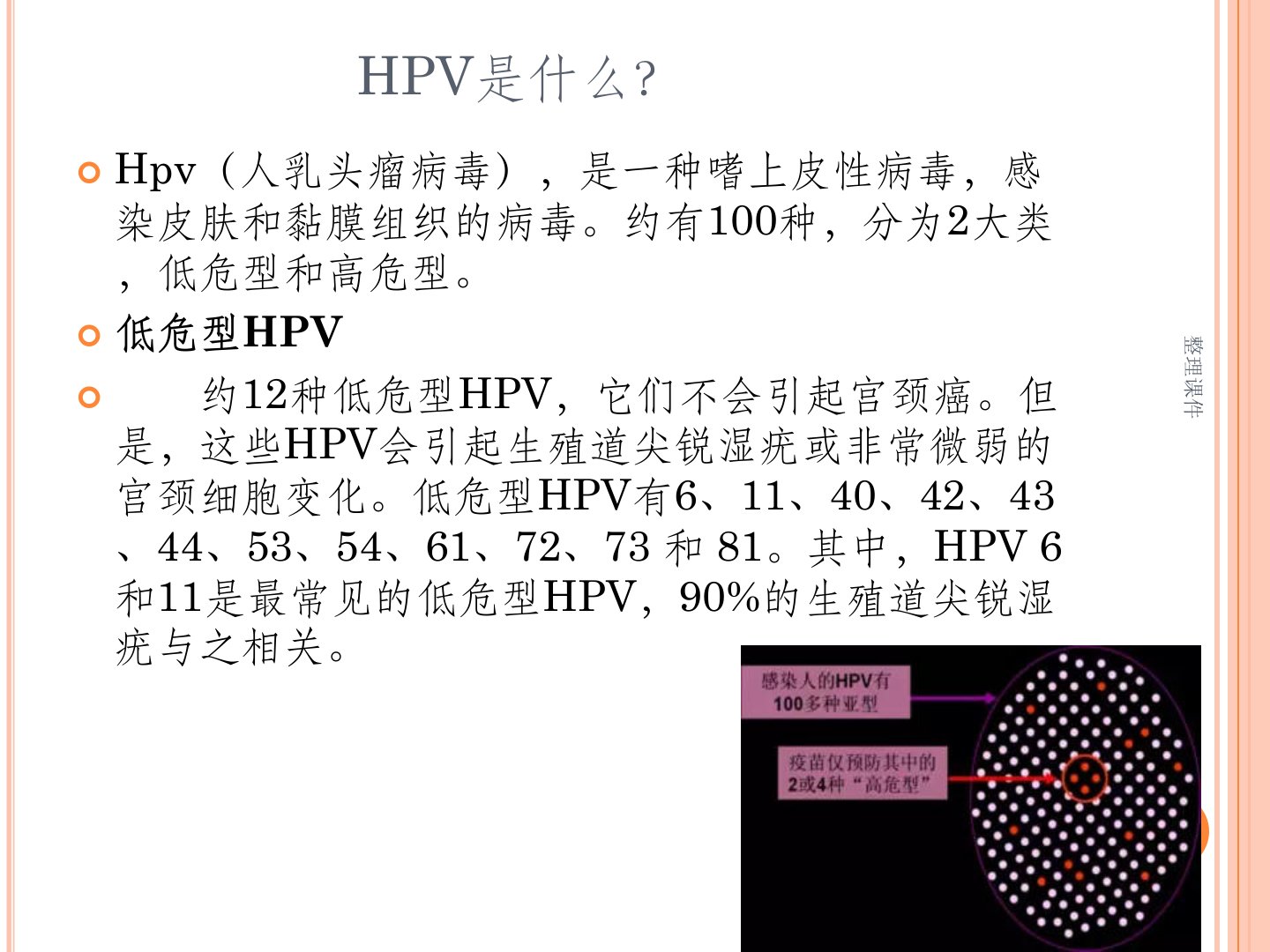 白银市第一人民医院刘春晖介绍了HPV病毒相关知识。HPV(人乳头瘤病毒)是嗜上皮性病毒分低危型和高危型两类共约100种。低危型约12种不会引发宫颈癌但会引起生殖道尖锐湿疣或微弱的宫颈细胞变化其中HPV6和11最常见90的生殖道尖锐湿疣与其相关。高危型有13种能引起宫颈细胞异常改变不及时处理可能发展成宫颈癌其中16型和18型最常见约70的宫颈癌与其相关。持续高危型HPV感染是宫颈癌发生必要条件检测HPV病毒可早期防治宫颈癌。HPV主要通过性、密切和间接接触传播大部分感染可自动消除。80女性有机会感染HPV其本身并非疾病多数可被清除少数持续感染会引发宫颈病变。目前有两种认证HPV疫苗主要用于预防与70宫颈癌相关的HPV16型和18型。预防HPV要保持少性伴侣、用避孕套、禁烟、补充叶酸和多种维生素。目前没有针对HPV病毒的药物最有效途径是及早发现并在癌变前治疗故定期筛查和检测很重要。