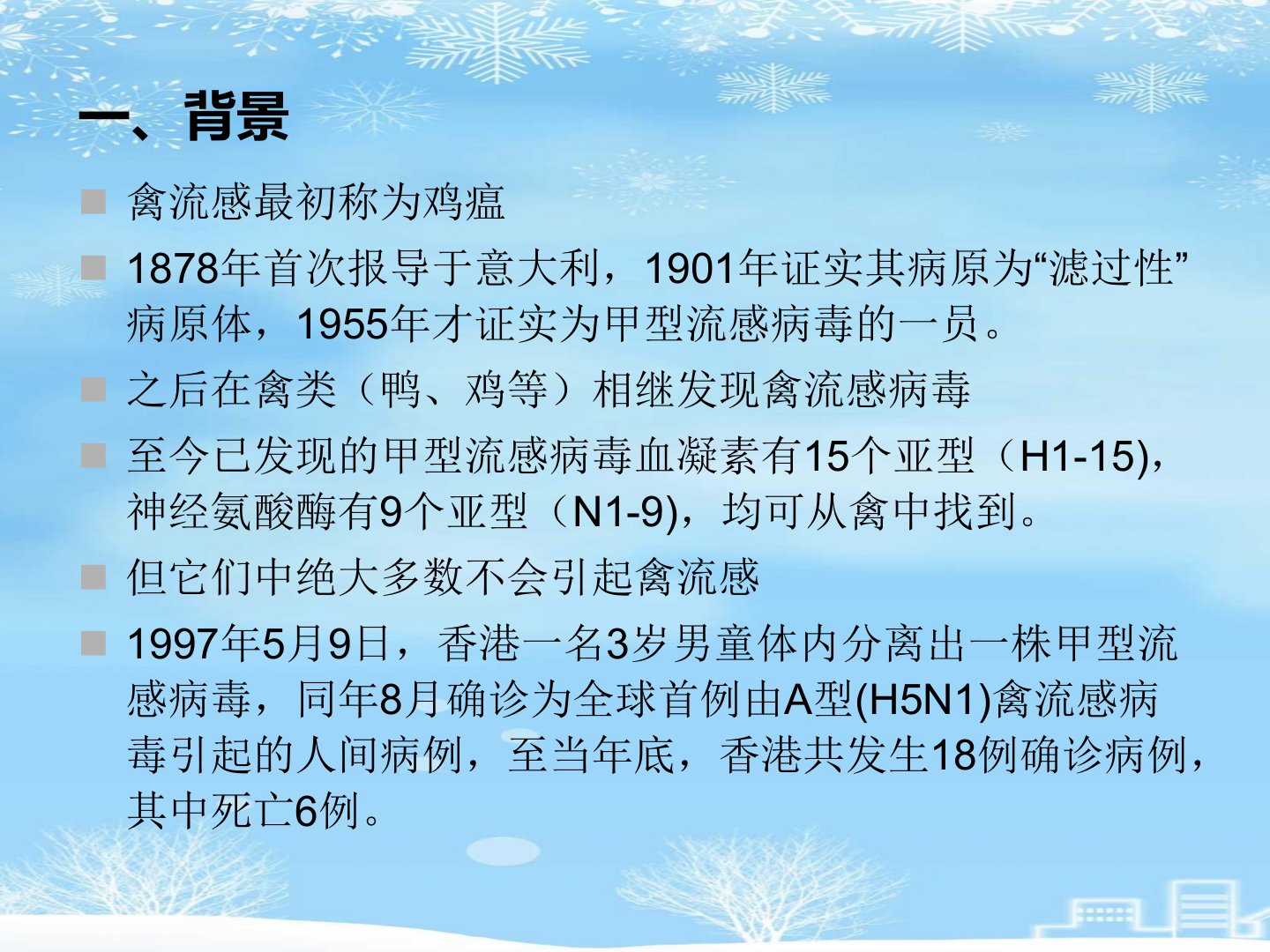 禽流感最初于1878年在意大利以“鸡瘟”之名被首次报导1955年证实为甲型流感病毒一员。至今已发现的甲型流感病毒血凝素有15个亚型神经氨酸酶有9个亚型均可从禽类中找到但绝大多数不会引发禽流感。1997年香港出现全球首例由A型H5N1禽流感病毒引起的人间病例年底共18例确诊6例死亡。流感病毒属正黏病毒科分甲、乙、丙型及托高土病毒属禽流感病毒属甲型可感染人、猪、马等多种动物。人感染禽流感后潜伏期7天以内会突发疾病出现发热、咳嗽、咽痛等症状少数有消化道症状。为防制禽流感需养成良好卫生习惯养鸡人员等密切接触者更应如此工作时戴口罩、穿工作服减少直接接触工作服要清洗消毒接触污物后洗手处理粪污戴手套疫情时减少与禽类接触并做好防护。
