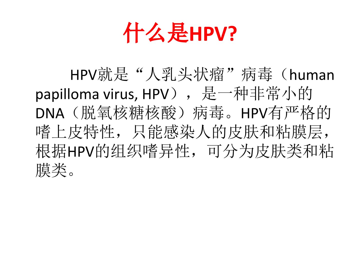 HPV检查与宫颈癌什么是HPV? HPV就是“人乳头状瘤”病毒(humanpapillomavirus,HPV),是一种非常小的DNA(脱氧核糖核酸)病毒。HPV有严格的嗜上皮特性,只能感染人的皮肤和粘膜层,根据HPV的组织嗜异性,可分为皮肤类和粘膜类。HPV有多少亚型?目前已有120多种HPV基因型被确定。不同的HPV亚型可引起不同的疾病。各型HPV可引起哪些疾病?HPV与宫颈癌的关系HPV是导致女性第二常见癌症——宫颈癌的罪魁祸首,这一发现获得了2008年度诺贝尔生理学与医学奖。1995年,国际癌症研究机构(IARC)专题讨论会通过——HPV感染是宫颈癌的主要原因,即HPV感染是宫颈癌...