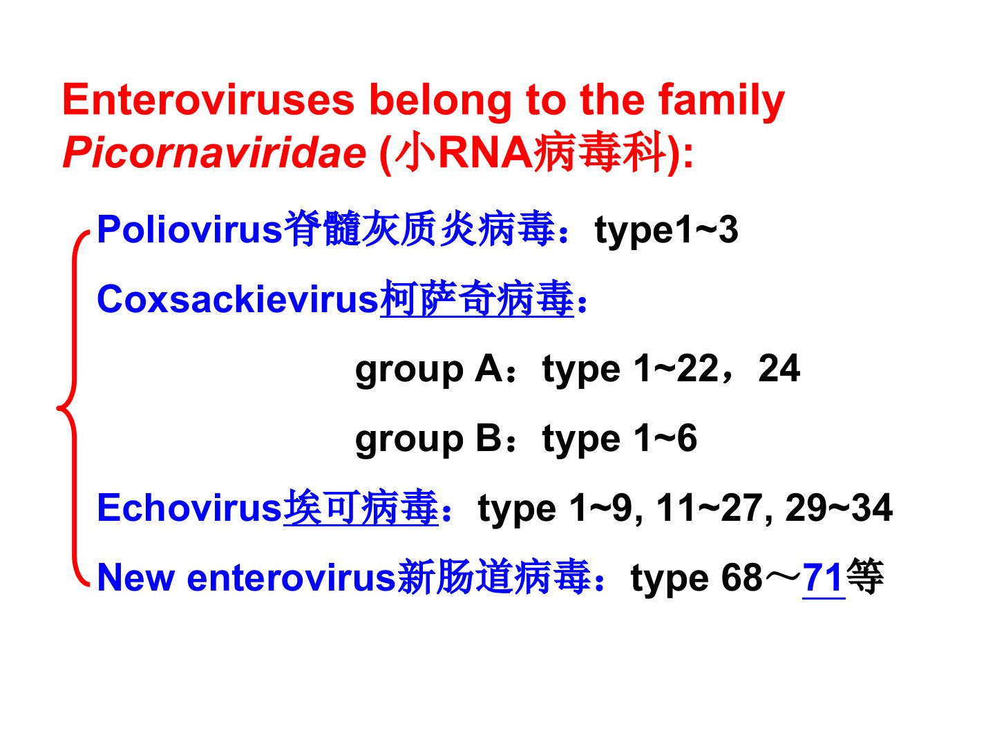 第26章肠道病毒EnterovirusPoliovirus脊髓灰质炎病毒:type1~3Coxsackievirus柯萨奇病毒:groupA:type1~22,24groupB:type1~6Echovirus埃可病毒:type1~9,11~27,29~34Newenterovirus新肠道病毒:type68~71等EnterovirusesbelongtothefamilyPicornaviridae(小RNA病毒科):Coxsackievirus。柯萨奇病毒是1948年在美国纽约州柯萨奇镇,从一名疑似脊髓灰质炎患者粪便中用接种乳鼠的方法首次分离出的。根据对乳鼠的致病性不同,Coxsacki...