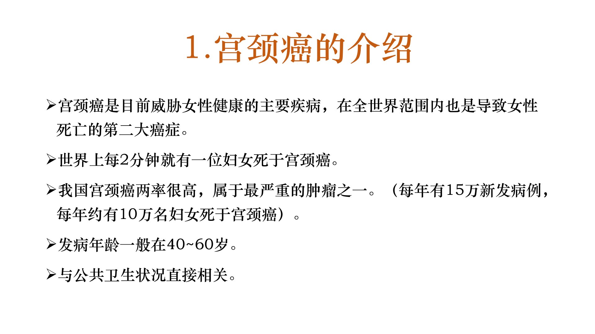 宫颈癌是威胁女性健康的主要疾病全球范围内致死率居女性癌症第二我国每年新发病例15万死亡约10万发病年龄集中在4060岁与公共卫生状况相关。早期宫颈癌多无症状中后期可出现接触性出血、阴道分泌物增多等症状晚期伴有疼痛、肿胀及二便异常。其主要致病因素为高危型HPV持续感染协同因素包括性生活过早、多产密产、多个性伴、宫颈病变及性传播疾病等。HPV是一组小环状双链DNA病毒稳定性好广泛分布嗜上皮性在基底层细胞中潜伏。目前已发现超200种HPV型别分低危型和高危型中国人常见型别为52、58、CP8304(81)。HPV感染后绝大部分会被机体免疫力自动清除高危型HPV持续感染后可发生癌前病变或宫颈癌。HPV感染具有普遍性、一过性、地区差异性传播途径包括性接触、非性直接接触、间接接触、医源性感染及母婴传播性行为、月经分娩因素、其它病毒感染、吸烟等属高危人群。预防需坚持健康生活方式、加强健康教育、定期检测、及时治疗及接种疫苗。HPV检测常用染色镜检、HPVDNA检测及血清学试验等方法。