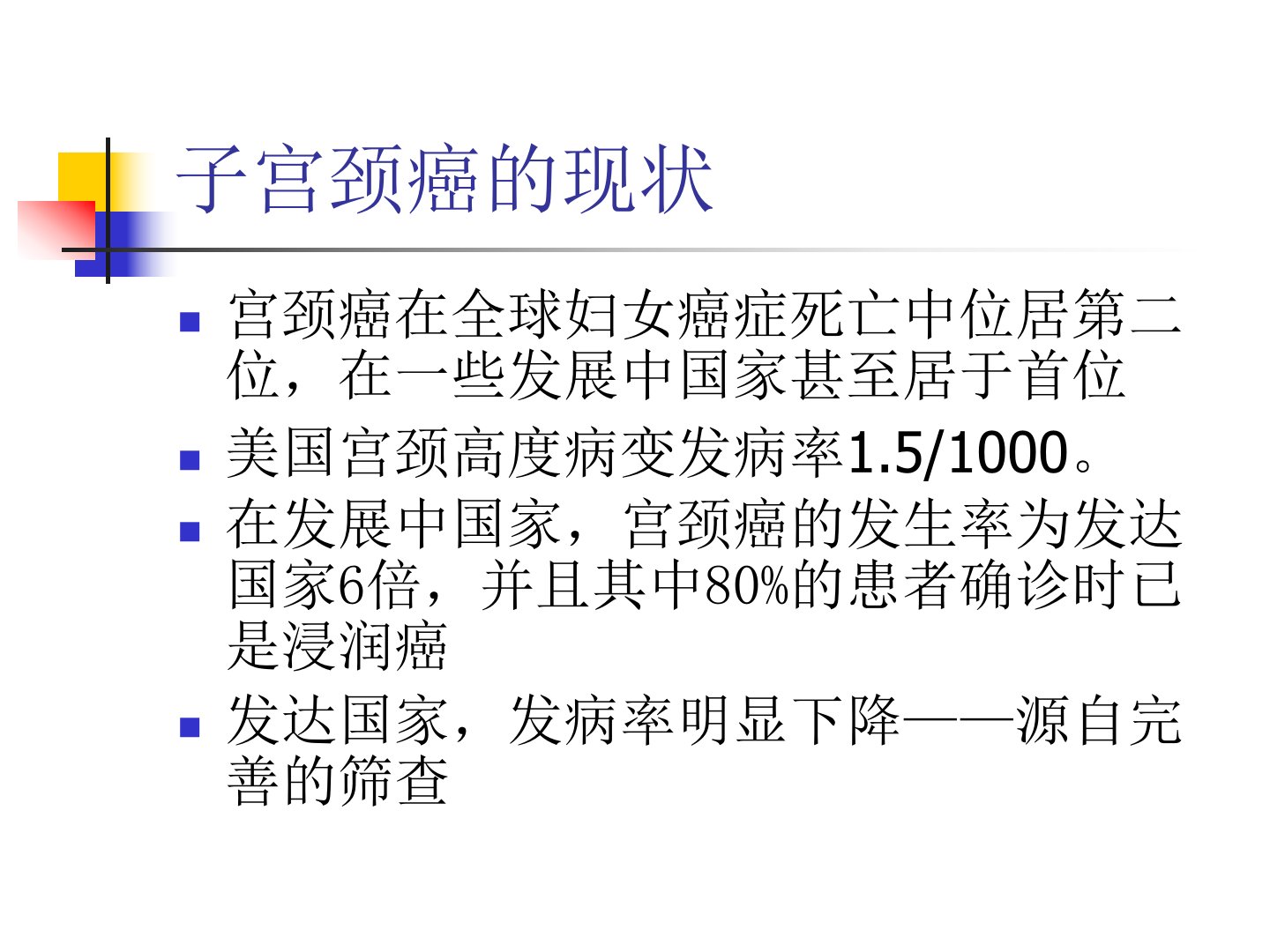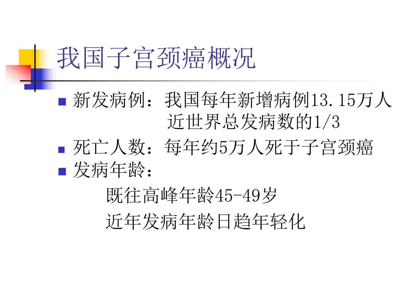 2宫颈癌在全球妇女癌症死亡中位居第二位,在一些发展中国家甚至居于首位在发展中国家,宫颈癌的发生率为发达国家6倍,并且其中80%的患者确诊时已是浸润癌发达国家,发病率明显下降——源自完善的筛查新发病例:我国每年新增病例13.15万人近世界总发病数的1/3死亡人数:每年约5万人死于子宫颈癌发病年龄:既往高峰年龄45-49岁近年发病年龄日趋年轻化子宫颈癌患者年轻化我国年轻化倾向明显,由60年代的平均53岁到90年代的42岁小于35岁宫颈癌在全部宫颈癌所占比例70年代--1.22%80年代--1.42%90年代初--5.01%90年代末--9.88%我院宫颈癌及癌前病变2334-76岁,其中40岁以下...