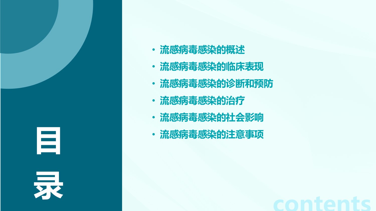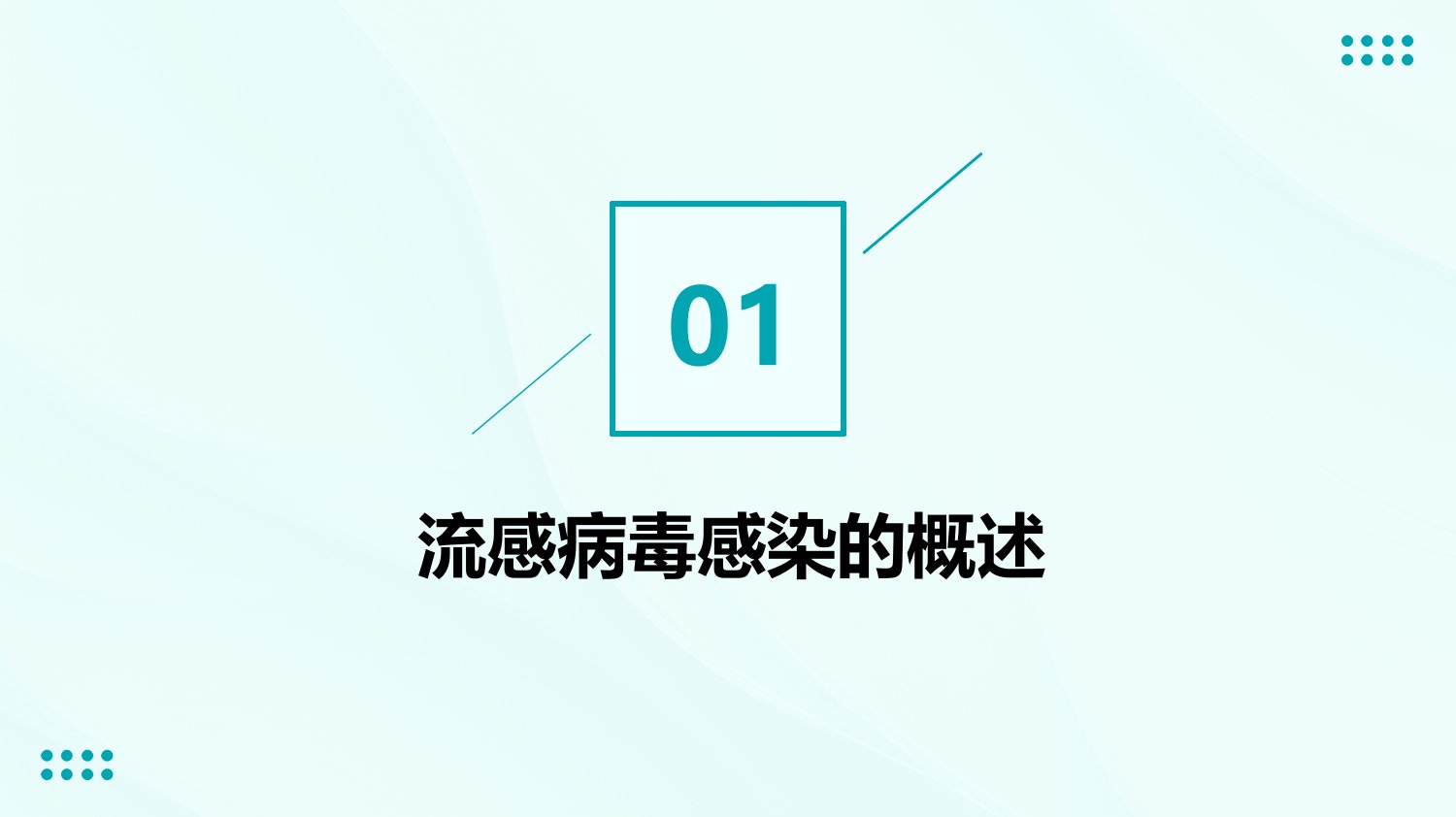 2023流感病毒感染ppt摘要流感是由流感病毒引起的急性呼吸道传染病具有高度传染性和流行性。病毒分A、B、C三型A型变异强易大规模流行主要通过飞沫、接触和空气传播。老年人、儿童、孕妇和体弱者感染后危害更严重可能引发肺炎、心肌炎等并发症对社会稳定和经济发展造成不良影响。流感症状包括高热、咳嗽、肌肉疼痛、乏力等潜伏期14天病程分潜伏期、前驱期、极期和恢复期。诊断依赖临床症状和病毒检测预防需增强免疫力、避免接触感染源和接种疫苗。治疗包括抗病毒治疗、对症治疗和免疫调节常用药物有奥司他韦等。护理需隔离防护、保持个人卫生、合理饮食和心理支持。流感影响社会减缓社会进步增加社会负担影响经济发展和个人健康。注意事项包括保持个人卫生、加强锻炼、健康饮食等。