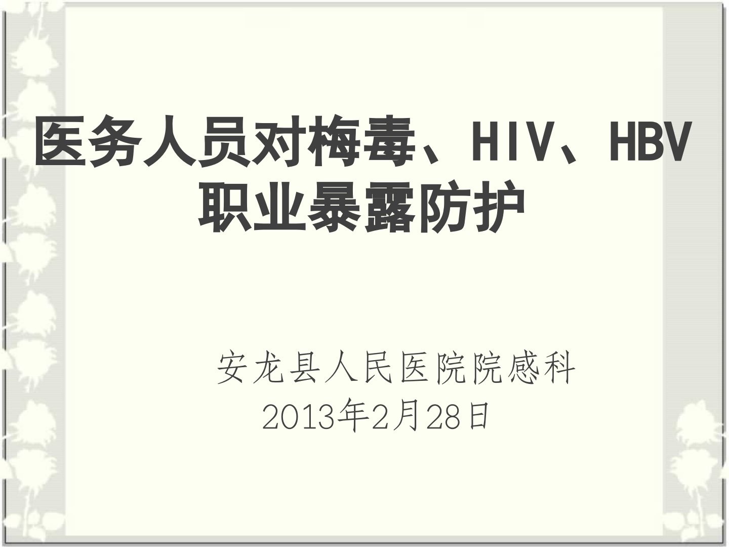 安龙县人民医院院感科于2013年2月28日介绍了医务人员对梅毒、HIV、HBV职业暴露的防护。职业暴露指医务人员在职业活动中受物理、化学或生物等有害因素影响损害健康甚至危及生命的情况。梅毒以2年为界分早期和晚期梅毒有不同症状表现。HIV即艾滋病传播途径为性、血液、母婴传播血液暴露后应一挤二冲三消毒四上报。容易发生职业暴露的环节有注射、产科、口腔科操作等职业分布主要是护士、实验室技术人员和医生。预防上要遵照标准预防原则接触病源物质时采取戴手套、口罩、防护眼镜等防护措施正确处理锐器。发生职业暴露后要进行危险性评估分三级暴露和三种病毒载量水平类型据此决定是否预防性服药并做好报告、毒副作用监测、监测与咨询等工作。乙型肝炎由HBV引起未经疫苗注射者被刺伤感染几率高预防最有效方法是注射疫苗我院2012年10月已对职工进行相关体检和疫苗注射。