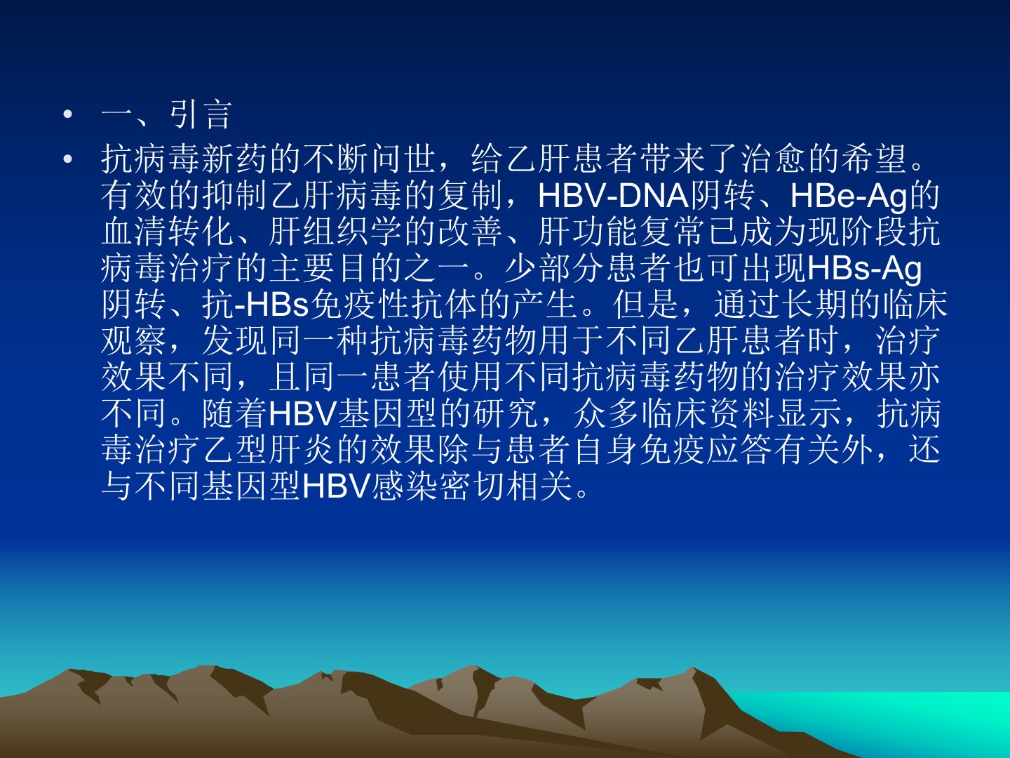 HBV基因分型与临床摘要抗病毒新药为乙肝患者带来治愈希望但临床发现同种药物对不同患者或同一患者用不同药物效果有差异。众多临床资料显示抗病毒治疗乙型肝炎的效果除与患者自身免疫应答有关外还与不同基因型HBV感染密切相关。HBV基因型即其核苷酸序列差异分型方法主要有全基因序列测定、S基因序列测定、克隆抗体酶联免疫黏附ELISA分型法、PCRRFLP分型法。HBV按基因组核苷酸序列分为AH8型有特定地域分布特征。研究表明我国乙型肝炎患者HBV基因型主要是B、C和D型C型居多且C基因型与疾病严重程度有关。人类感染HBV基因组的型别可能与感染途径相关不同基因组致病性不同。在抗病毒治疗方面不同基因型对干扰素等治疗应答不同感染不同基因型HBV患者接受干扰素治疗的合理疗程也应不同。不同基因型还与某些变异相关不同基因型HBV感染后的临床病情、对治疗的反应不同。