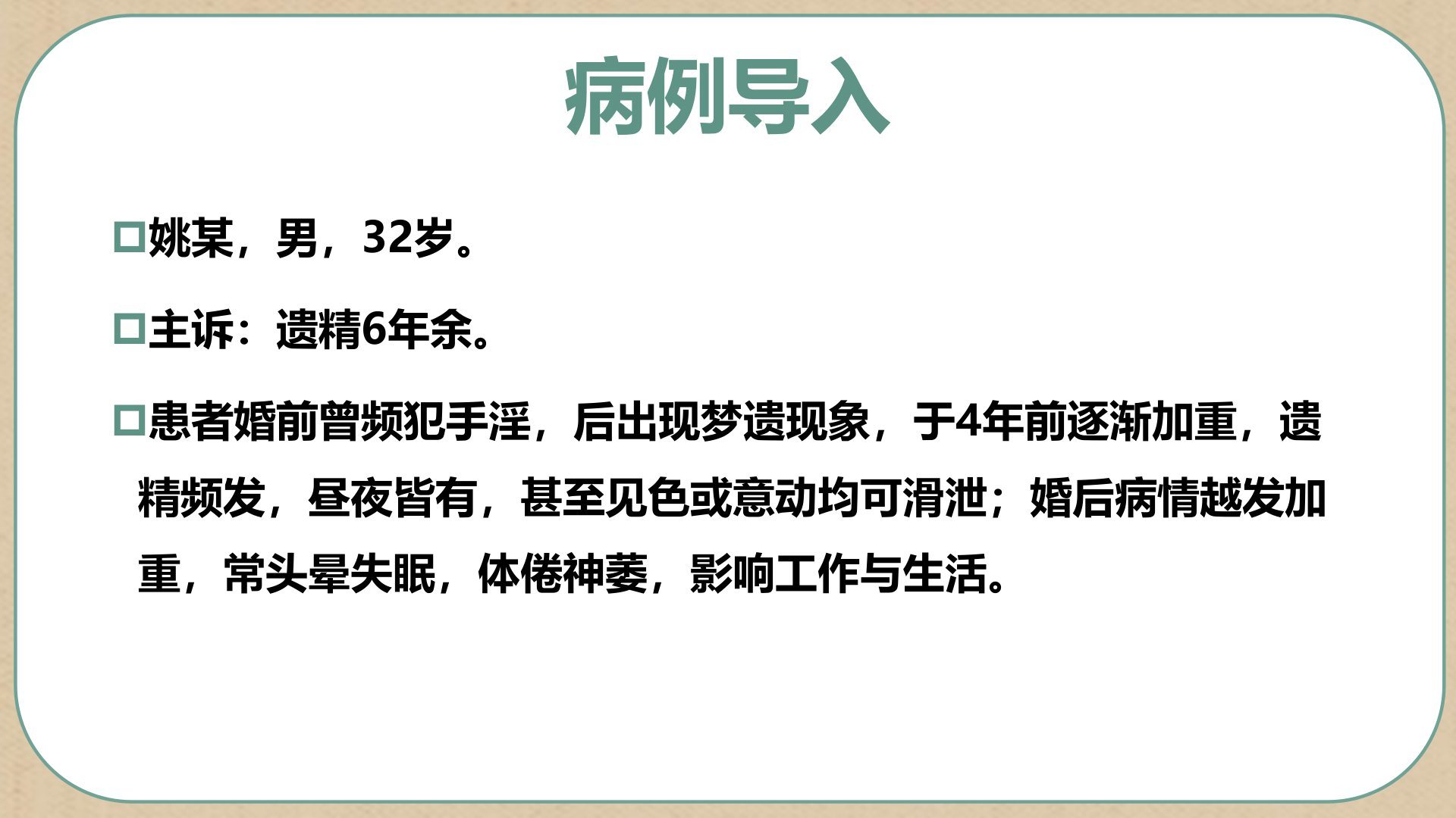 作为医生对遗精病症的掌握要点如下:遗精指不因性生活而精液频繁遗泄分为梦遗和滑精。未婚或已婚无正常性生活成年男子每月12次属正常。遗精常与情欲妄动、劳倦过度等因素有关病位在肾与心、脾、肝关系密切基本病机是肾失封藏、精关不固。辨证要点主症为频繁遗精每周2次以上分肾气不固、心脾两虚、阴虚火旺、湿热下注等证型。治疗基本方法为调肾固精取任脉穴及肾的背俞穴、原穴为主主穴有关元、肾俞等配穴依证型选择。如病例中姚某32岁遗精6年余中医诊断为遗精证型肾气不固治法调肾固精取关元、肾俞等穴毫针常规刺肾气不固和心脾两虚者可加灸。针灸治疗遗精效果较好功能性遗精需消除患者思想顾虑器质性疾病引起者需同时治疗原发病治疗同时要戒除不良习惯。