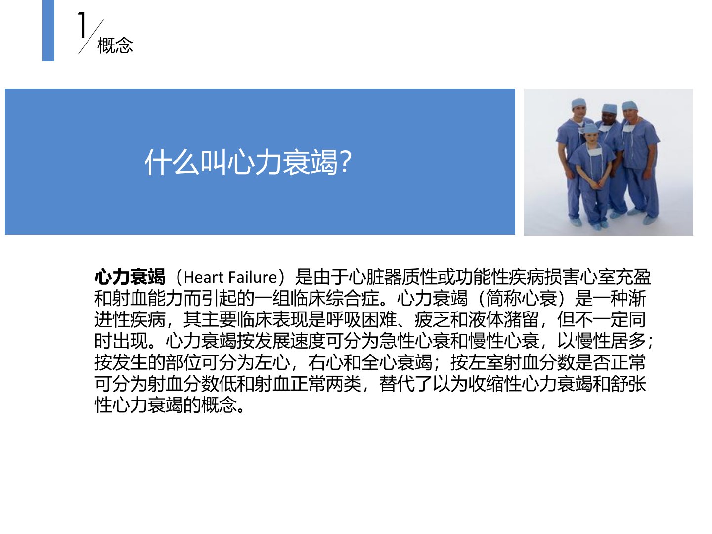 心力衰竭摘要心力衰竭(HeartFailure)是因心脏器质性或功能性病变损害心室充盈与射血能力引发的一组临床综合症属渐进性疾病主要症状为呼吸困难、疲乏和液体潴留但不一定同时出现。按发展速度分急性和慢性心衰以慢性居多;按发生部位分左心、右心和全心衰竭;按左室射血分数是否正常分射血分数低和射血正常两类。急性心衰是心脏功能异常引发的急性发作无论有无心脏病史均可发生以急性左心衰竭常见多表现为急性肺水肿或心源性休克。病因包括心脏解剖或功能突发异常、心脏收缩力突然减弱等。诊断依据典型症状和体征。治疗上要立即协助病人取坐位双腿下垂进行氧疗严密监测各项指标迅速开放静脉通道并正确用药做好心理护理、基础及日常生活护理常用药物有吗啡、利尿剂等。同时患者需绝对卧床休息合理饮食按时服药循序渐进活动避免诱发因素长期卧床患者还需预防压疮。