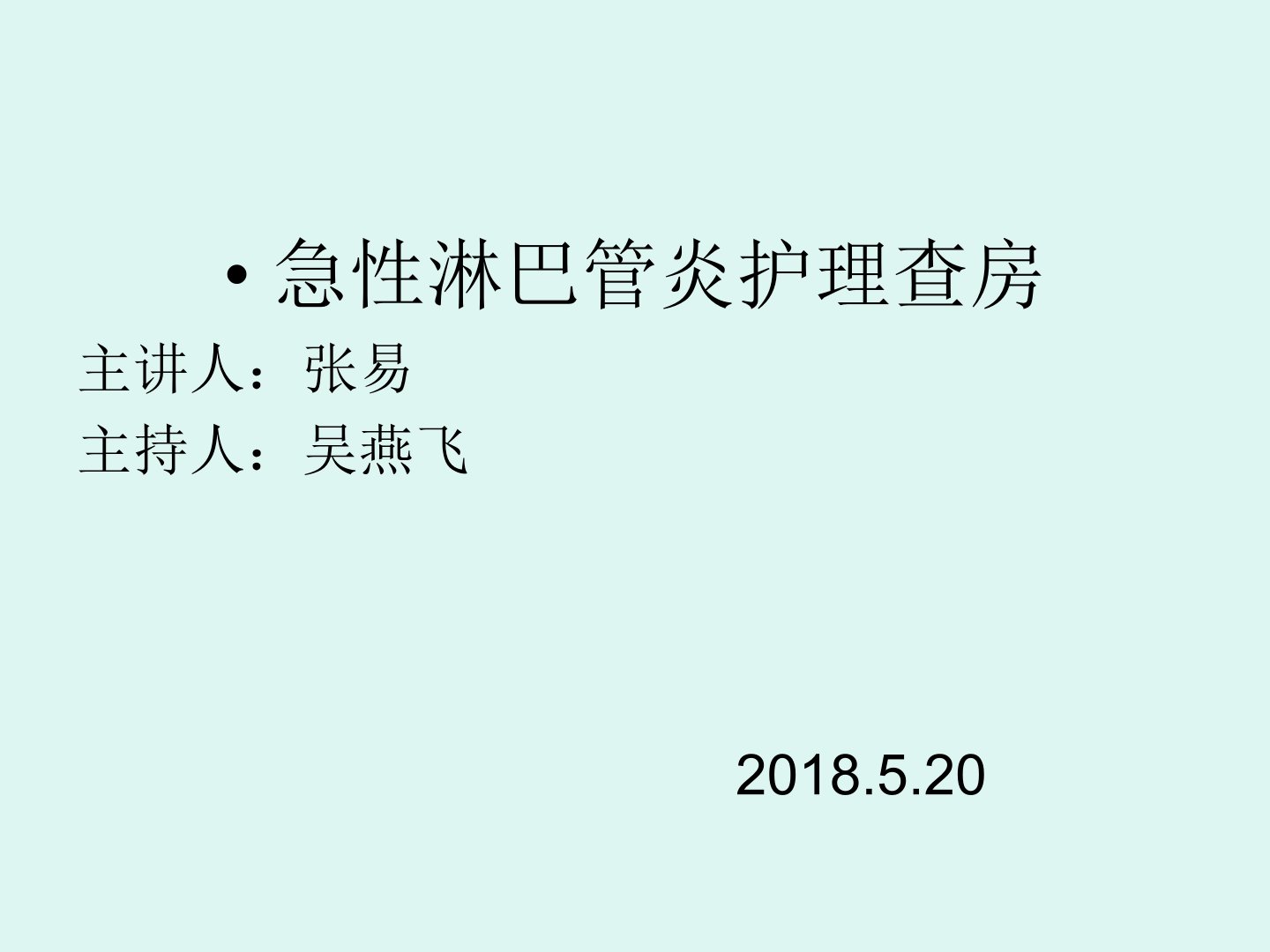 急性淋巴管炎护理查房摘要本次查房围绕85岁男性患者吕凤洲的急性淋巴管炎护理展开。患者因寒战发热5小时入院诊断包括右腿急性淋巴管炎、尿路感染等多种疾病。急性淋巴管炎是致病菌经破损处侵入淋巴流引发的炎症金黄色葡萄球菌、溶血性链球菌是主要致病菌临床表现因类型而异。治疗上局部处理视情况采用外敷药物或引流全身则及时合理使用抗生素。护理方面针对患者体温过高、自理能力下降、疼痛、排尿方式改变、焦虑、感染、营养失调、潜在低血糖、皮肤完整性受损危险等问题制定并实施了相应护理措施如给予抗感染治疗、加强生活护理、协助患者取舒适体位等。此外还进行了相关知识学习包括尿路感染、膀胱冲洗、尿细菌培养标本采集、败血症的定义及急性淋巴管炎家庭护理要点等。