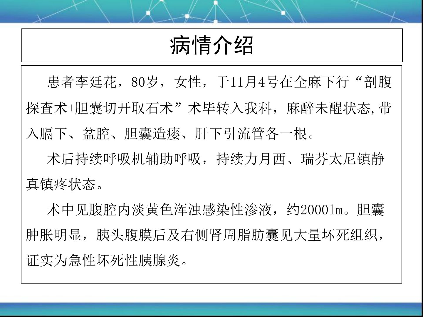 80岁女性患者李廷花于11月4号在全麻下行“剖腹探查术胆囊切开取石术”术中发现腹腔感染性渗液约2000ml胰头、腹膜后及右侧肾周脂肪囊有大量坏死组织确诊为急性坏死性胰腺炎。术后患者持续呼吸机辅助呼吸并给予镇静镇痛治疗。11月5号心电监护示心房纤颤7号顺利停机拔管10号拔除腹下引流管期间给予鼻肠管内注入营养液患者体温多在3637C之间11月12号病情好转转普外科继续治疗。胰腺是人体第二大消化器官具有外分泌和内分泌功能。急性胰腺炎是多种病因导致胰酶在胰腺内被激活后引起的炎症反应按病程及严重程度可分为轻型、重型和暴发性三类其中胆道梗阻是最常见病因。临床表现包括腹痛、恶心、呕吐、腹胀等重症可继发感染、腹膜炎和休克。术后采取禁食、胃肠减压、抗感染、抑酸、营养支持等措施并严密监测生命体征及出入量。留置的引流管需妥善固定保持引流通畅防止感染。另外腹内压测定是诊断腹腔高压症和腹腔间室综合症的重要依据连续动态测定对早期诊断、及时治疗及护理、提高危重病人的治疗效果有着重要意义。