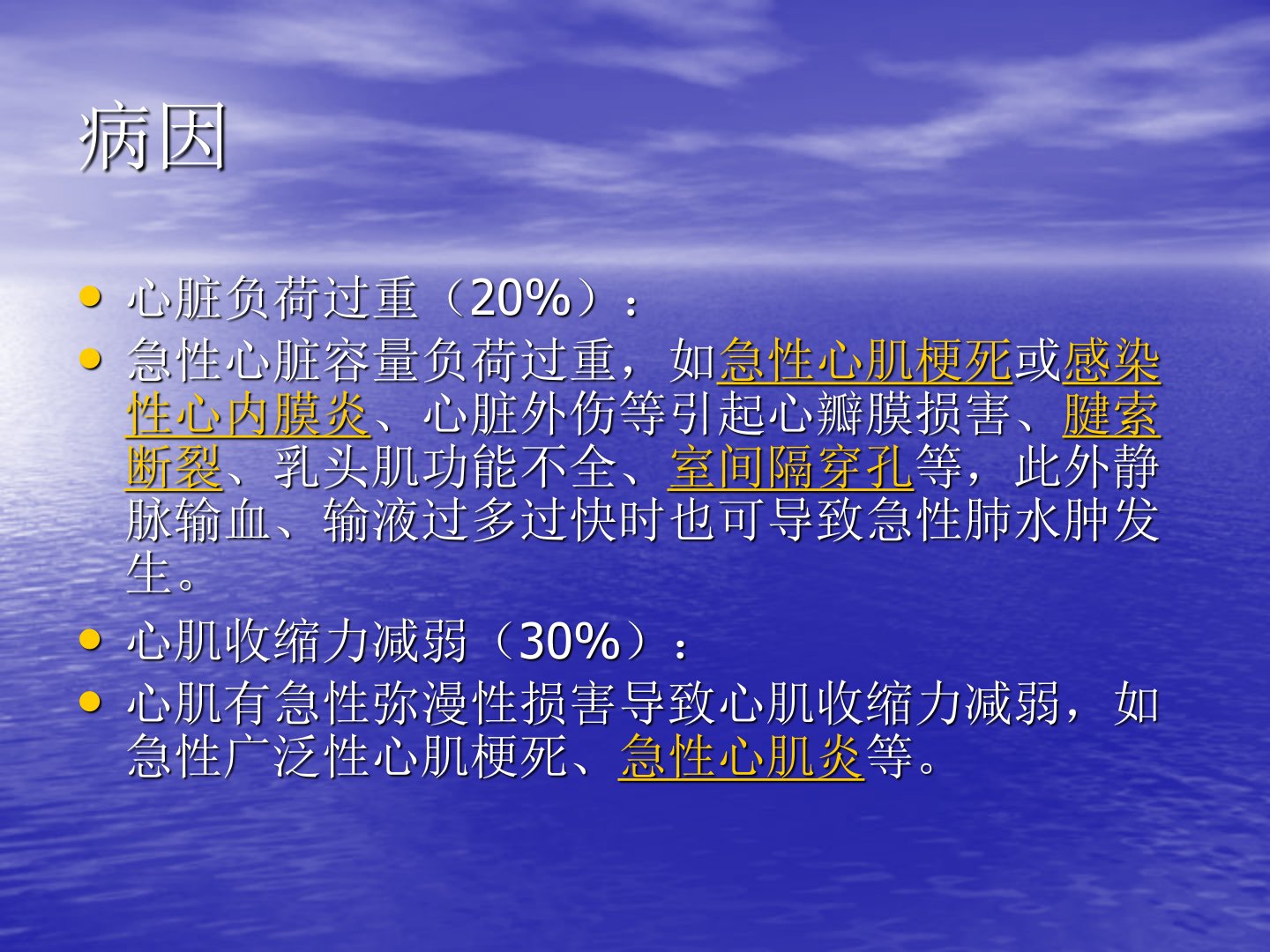 急性肺水肿可由心脏负荷过重(如急性心脏容量负荷过重、心肌收缩力减弱、心脏压力负荷过重、心室舒张受限等)、组织代谢增加和循环加速(如甲状腺功能亢进、严重贫血等)引发。以一51岁男性患者为例其因“间断发热伴咳嗽、痰血5天”入院5天前受凉后出现咳嗽、白色黏痰、痰中带血、发热、剑突下疼痛、活动后胸闷气喘心悸等症状在明光市中医院治疗无改善省立医院胸部CT示两肺感染性病变后转至我院。查体两肺呼吸音粗两中下肺闻及细湿啰音。护理上需取坐位或半卧位两腿下垂;高流量吸氧并用酒精湿化;必要时用镇静剂(昏迷休克严重肺部疾病患者禁用);静注快速利尿剂、强心剂等。预防主要针对病因或诱因控制输液速度和种类术中应用中心静脉压监测指导输液输血保持呼吸道通畅并给予呼吸支持。