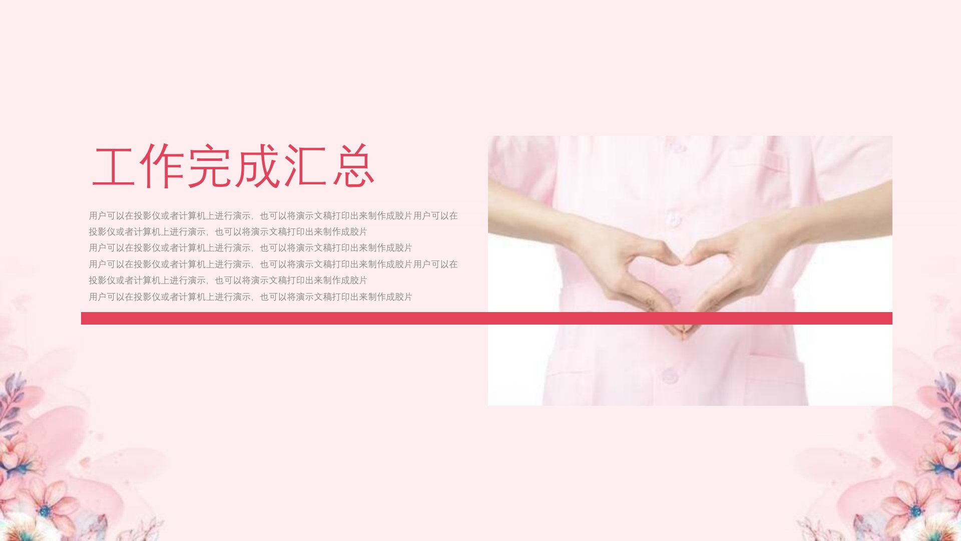 护士医疗工作汇报摘要本次汇报由护士XXX于日期XXX进行内容涵盖工作完成情况、存在问题、完成展示及下一步计划。工作完成方面汇报中虽未详述具体内容但提到了通过多种形式(投影仪、计算机演示及打印胶片)进行工作展示体现了工作汇报的多样性与灵活性。在工作存在的不足方面汇报指出了多项问题但具体内容未详细列出仅以占位符形式呈现提示需进一步分析和改进。工作完成展示部分同样以占位符和图片替换说明为主未给出具体实例或数据但强调了通过图文并茂的方式增强汇报效果。下一步工作计划中汇报提出了明确目标并详细规划了实施步骤与预期成果包括目标设定、详细描述及语言风格要求等旨在通过简洁生动的语言概括段落内容提升汇报质量。