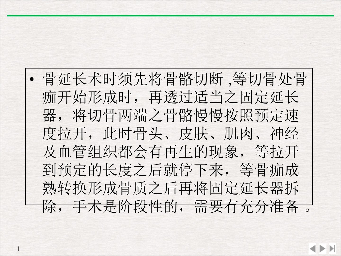 本文围绕骨延长术护理查房展开。首先介绍了骨延长术原理即将骨骼切断待骨痂形成后用固定延长器按预定速度拉开组织再生达到预定长度后等骨痂成熟拆除延长器且手术分截骨术安置骨延长器、延迟期固定骨段、牵张期牵开、固定期新骨形成四期。还阐述了骨延长的适应症、禁忌证及并发症。接着以47岁男性患者贾春新为例其因左大腿外伤术后问题多次治疗未愈后入院于2016年4月20日行多种手术。术后分阶段观察针对患者情况给出护理诊断如疼痛、焦虑、躯体移动障碍等11项。采取指导体位、心理安慰、功能锻炼、固定引流管尿管、营养支持等护理措施后患者病情平稳无并发症发生。最后给出出院指导要注意预防感染、松动加强锻炼并定期复查。