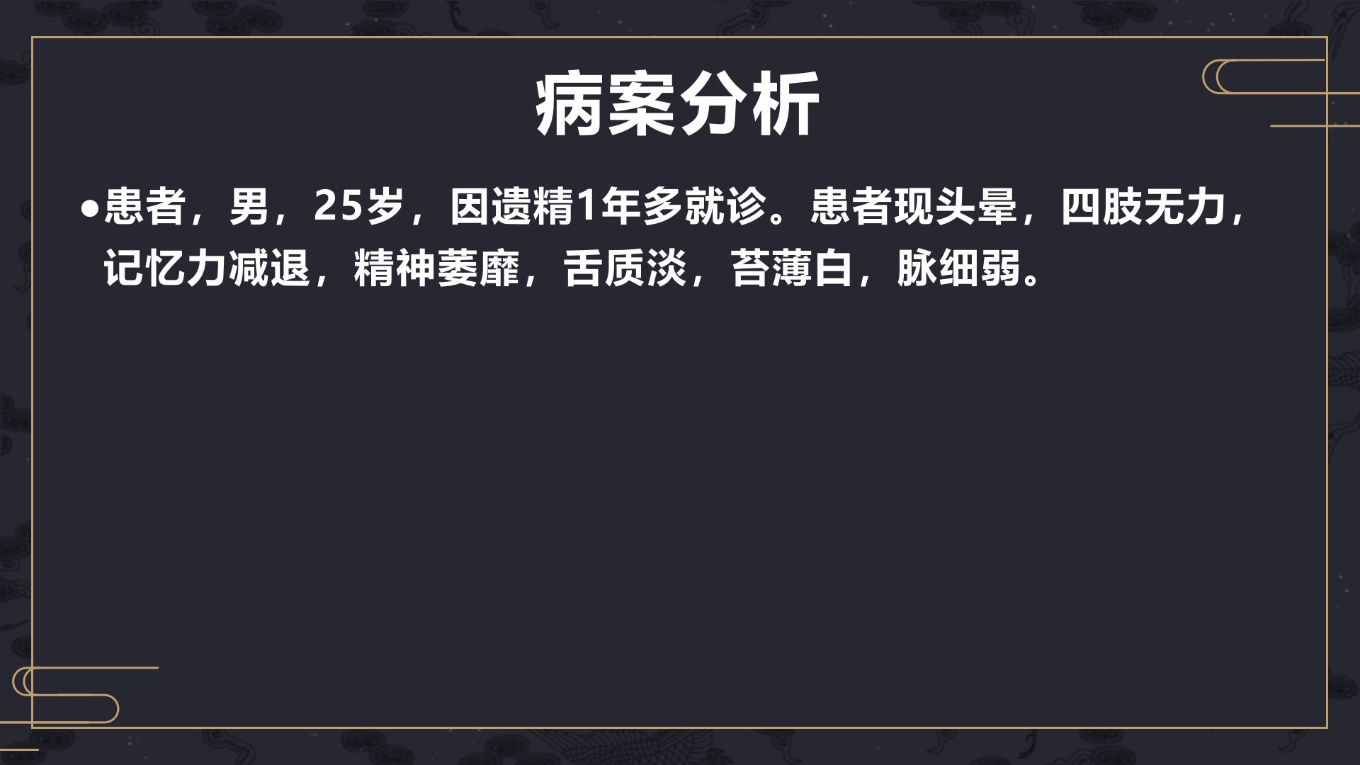 本文是一例遗精病案分析。患者25岁男性遗精1年多伴有头晕、四肢无力、记忆力减退、精神萎靡等症状舌质淡苔薄白脉细弱诊断为肾阳虚型遗精。遗精指不因性生活而精液频繁遗泄与情欲妄动、沉溺房事等因素有关病位在肾与心、肝、脾关系密切基本病机是肾失封藏、精关不固。治疗以益肾固摄为主取关元、三阴交、志室、肾俞、次髎等穴配穴依证型选择。除基本针刺治疗还包括耳针、穴位注射、皮肤针等其他疗法。现代研究表明针灸可调节大脑功能降低异常兴奋阻止异常神经信号传出达到治疗目的。本例中患者针灸取肾俞、命门等穴针刺用补法加灸治疗5次后症状明显好转10次后症状消失遗精停止。