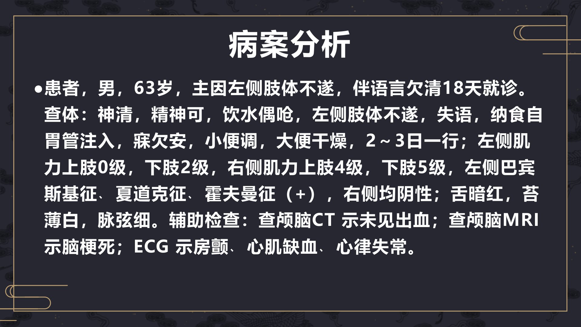 患者男63岁因左侧肢体不遂伴语言欠清18天就诊查体见其神清但左侧肢体不遂、失语左侧肌力明显弱于右侧舌暗红、苔薄白、脉弦细。辅助检查示脑梗死ECG示房颤、心肌缺血、心律失常。中医诊断为中风(中经络)西医诊断为脑梗死。中风与饮食不节、五志过极、年老体衰等因素有关风、火、痰、瘀为主要病因病位在脑涉及心、肝、脾、肾等脏。基本病机是脏腑阴阳失调气血逆乱上扰清窍。治疗以醒脑补髓、疏通经络为主取内关、上星透百会、印堂、三阴交等穴其中内关捻转提插泻法1分钟三阴交提插补法至肢体抽动极泉、委中提插泻法至肢体抽动(不留针)印堂斜刺施雀啄泻法上星透向百会小幅度高频率捻转余穴常规刺法。治疗后7天患者饮水呛咳消失可自行进流食;14天后左侧上肢肌力增至2级下肢增至3级寐安二便调言语欠流利。针灸治疗中风疗效满意尤其对功能康复有促进作用且开始越早效果越好。