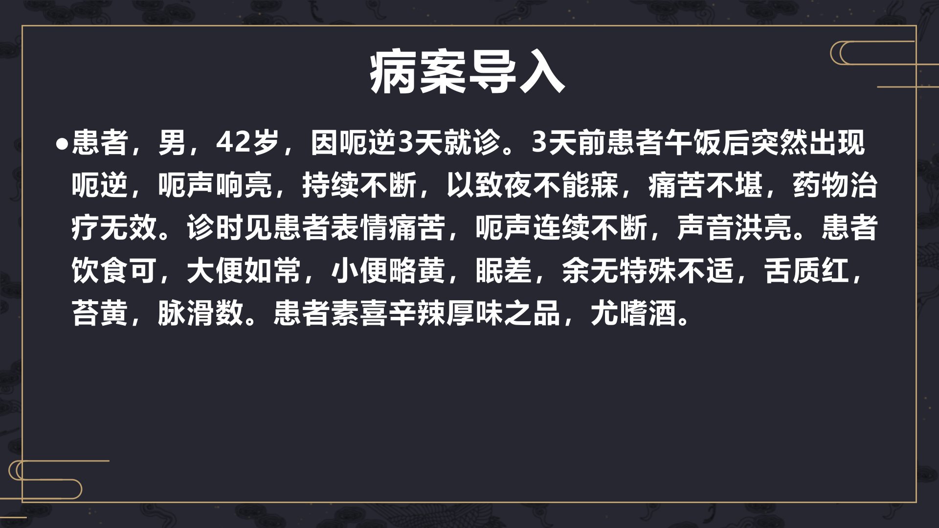 患者男42岁因持续3天的呃逆就诊呃声响亮、夜不能寐药物治疗无效。诊时患者呃声连续、声音洪亮眠差舌质红、苔黄、脉滑数素喜辛辣厚味且嗜酒。呃逆以喉间呃呃连声为主症多与饮食不当、情志不畅、正气亏虚有关病位在膈病变脏腑主要在胃基本病机是气逆动膈。辨证分型包括胃寒积滞、胃火上逆、肝气郁滞、脾胃阳虚、胃阴不足、气滞血瘀。治疗以宽胸利膈、和胃降逆为主主穴取膈俞、内关、中脘、足三里、膻中根据不同证型配穴。其他疗法包括穴位按压、耳针法、穴位敷贴。针灸对呃逆疗效良好对单纯性膈肌痉挛可即刻见效。本例患者诊断为呃逆辨证为实证(胃热盛)治则清热和胃、降逆止呃取中脘、内关、足三里、膈俞、内庭针用泻法治疗1次呃逆即止且未复发。