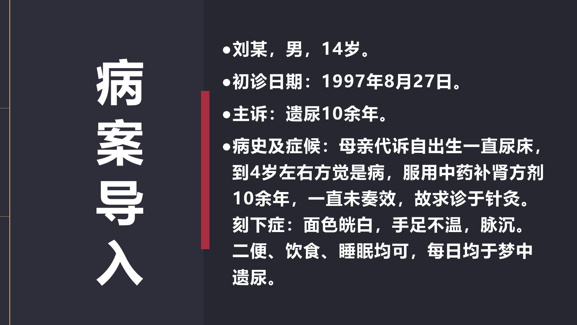 刘某男14岁遗尿10余年自出生一直尿床到4岁左右服用中药补肾方剂未奏效后求诊于针灸。患者面色白、手足不温、脉沉每日梦中遗尿。遗尿指5岁以上儿童睡中小便自遗与禀赋不足、久病体虚等有关病位在膀胱与任脉及肾、肺、脾、肝关系密切基本病机是膀胱和肾的气化功能失调。该患者辨证属脾肾不足。治疗以调理膀胱、温肾健脾为主取任脉穴及膀胱背俞穴、募穴如关元、中极、膀胱俞、肾俞、三阴交等配穴选夜尿点(手)、大钟、太溪关元艾灸。二诊时患者自一诊后1周未尿床守原方调理3个月期间仅因劳累遗尿一次后未再复发手足转暖夜间或自行醒来小便或一夜不起。针灸治疗遗尿疗效较好同时应消除患儿心理负担培养按时、睡前排尿习惯晚间控制进水量避免过度疲劳。