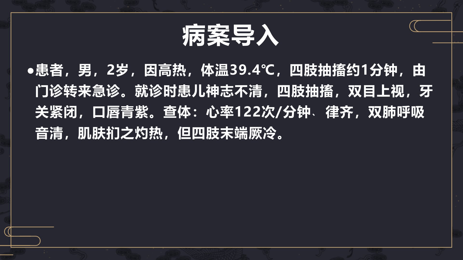 2岁男童因高热(体温394)引发四肢抽搐约1分钟被转至急诊。就诊时患儿神志不清、四肢抽搐、双目上视、牙关紧闭、口唇青紫查体见心率122次分钟、律齐肌肤灼热但四肢末端厥冷。抽搐是以四肢肌肉抽动等为主症的病证与感受六淫疫毒、暴怒、头部外伤、药物中毒、失血伤津等因素有关病位在脑累及肝基本病机为热极生风或虚风内动致筋脉失养。抽搐可见于小儿高热惊厥等疾病。治疗上基本治法为息风止痉、清热开窍取督脉、手足厥阴经穴为主主穴包括水沟、内关等配穴依证型选择。针灸治疗抽搐有一定疗效可镇惊止痉以救急但痉止后必须查明病因采取针对病因的治疗措施。本例患儿考虑为外感高热惊厥针刺后惊厥停止、神志清醒配合中西药治疗而痊愈。